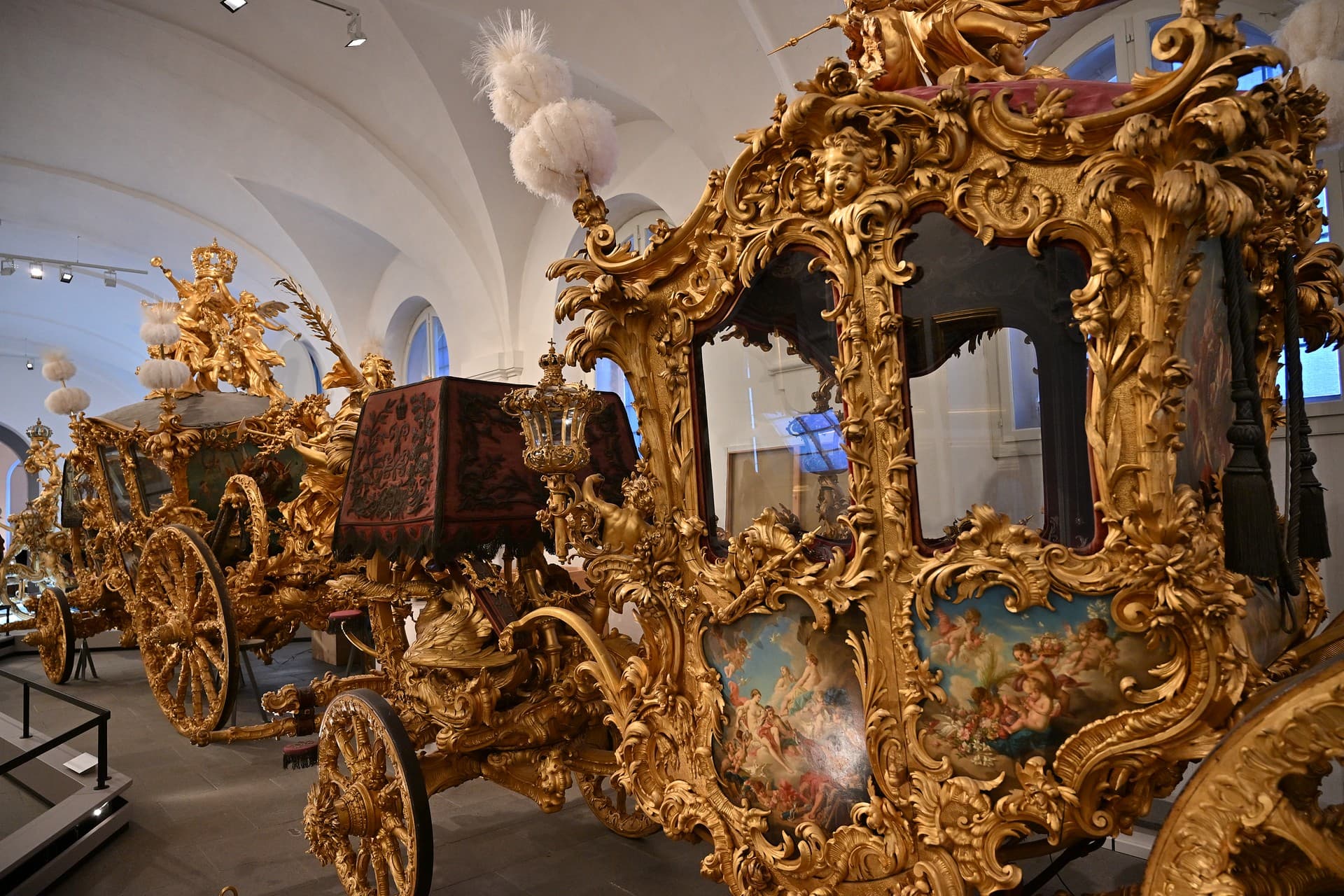 末代巴伐利亚国王路德维希二世嫌他祖辈留下的黄金马车艺术性不够,又亲自设计了几款小一些但更艺术的黄金马车们,以及几乘黄金雪橇,用来冬天往返新天鹅堡和慕尼黑):