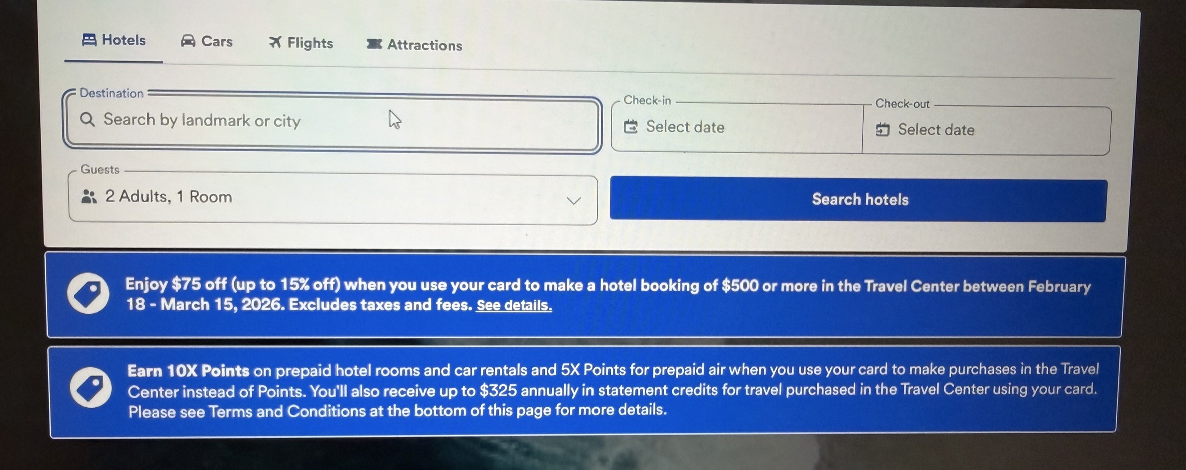 Enjoy $75 off (up to 15% off) when you use your card to make a hotel booking of $500 or more in the Travel Center between February 18 - March 15, 2026. Excludes taxes and fees. See details.
