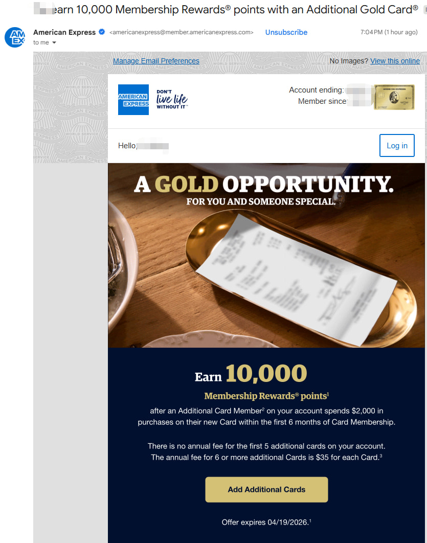新鲜出炉的个人Gold副卡offer,依然是花$2000给10000 MR。2026.4.19过期