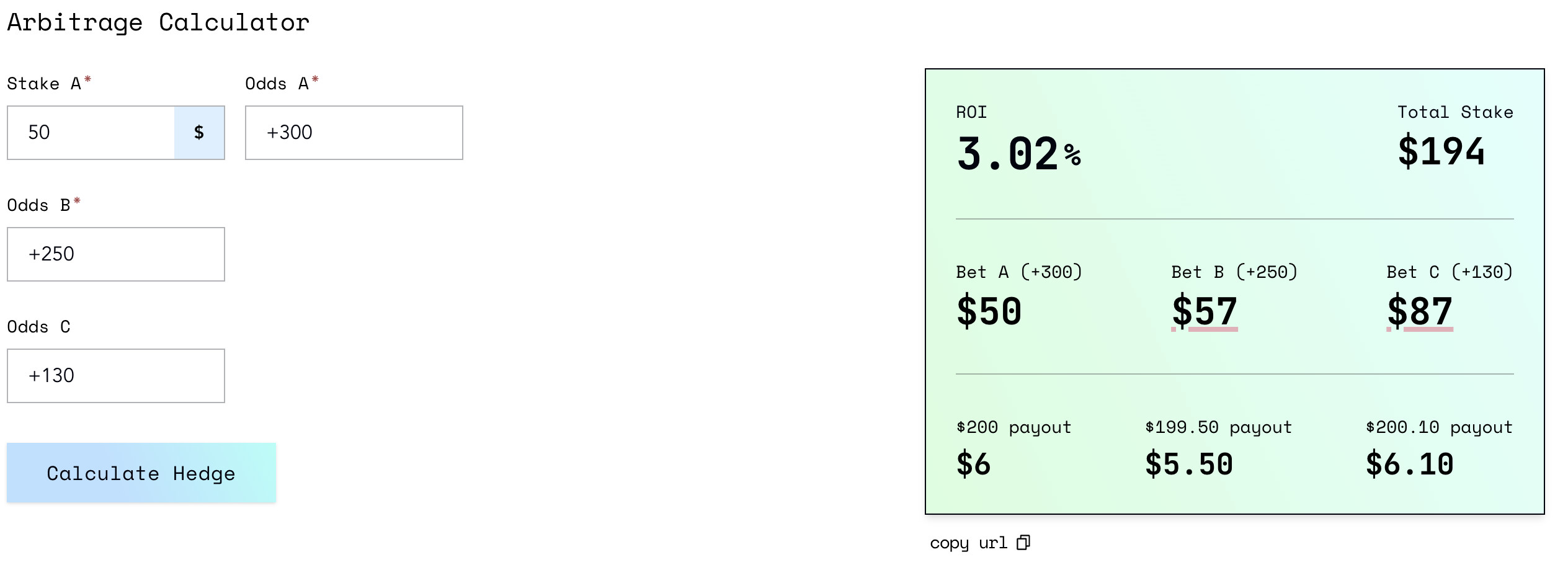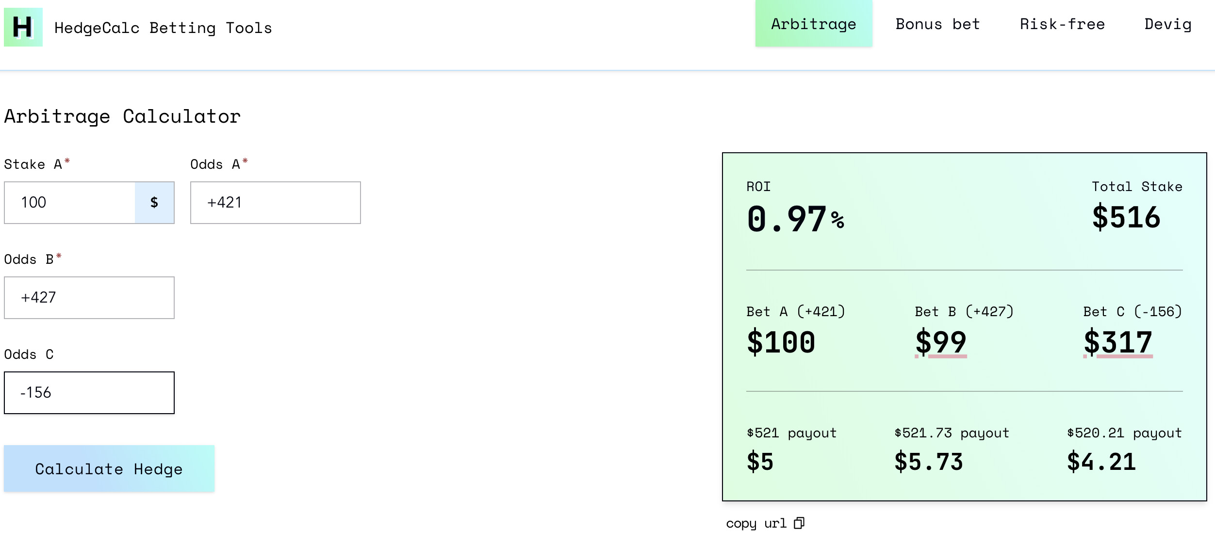 一个arbitrage calculator,例如这里和这里,用来计算最大化利润应该hedge的金额。虽说本质上就是个初中知识都不用的线性方程,但是有工具谁想自己算呢。