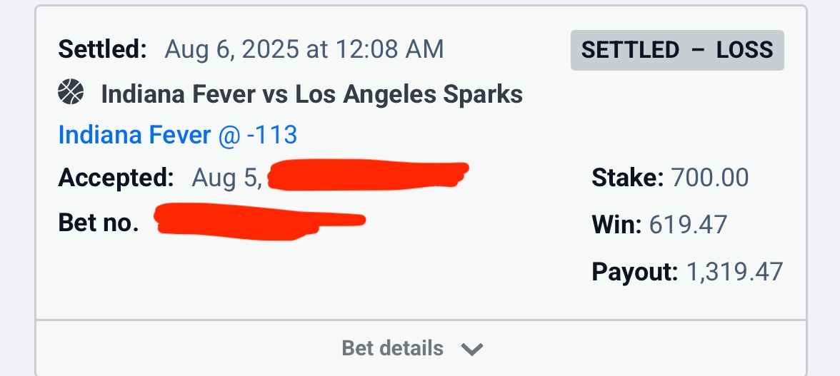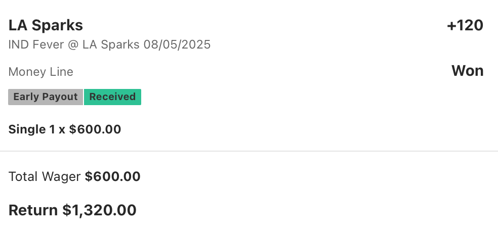 楼主早上发现这场比赛的Moneyline在Book A的Sparks赔率是+120,Book B的Fever赔率是-113,果断在Book A下注$600,在Book B下注$700,这样无论哪一方胜利,都有约$20的盈利。当然因为WNBA是相对小众的运动,楼主基于风控考虑没有下注太多。如果这是一场NBA比赛我至少会在Book A下注$2000,这样一场比赛就能有约$70的盈利。