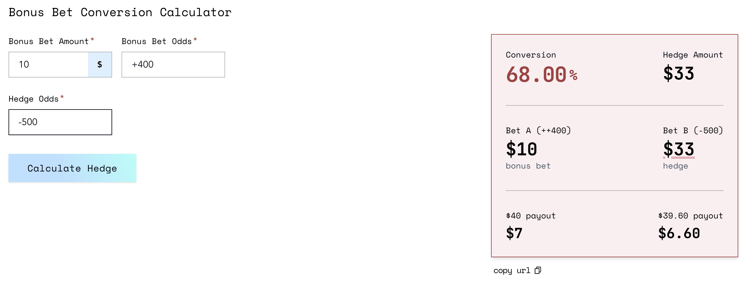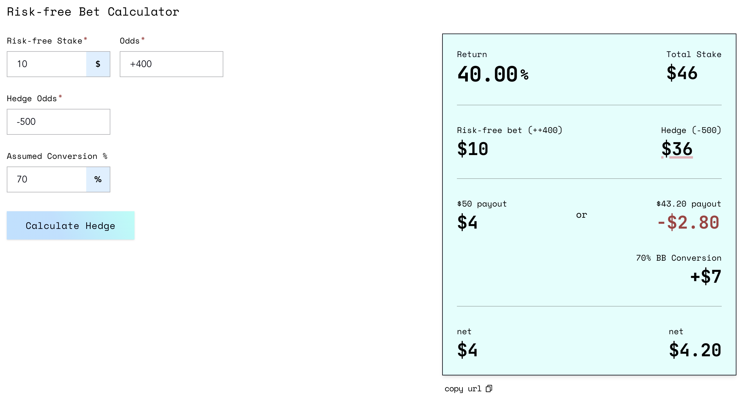 在risk-free bet中,book一般会规定一个金额,例如$10,然后你拿着这$10现金下注一个market参与risk-free bet。如果你赢了,就正常结算本金与利息,如果你输了,就返还给你$10的free bet。对于这种类型我们的策略和free bet基本相同。如果输了,就按照前一节另找一个market去convert返还的free bet。还是以一个+400/-500 market为例: