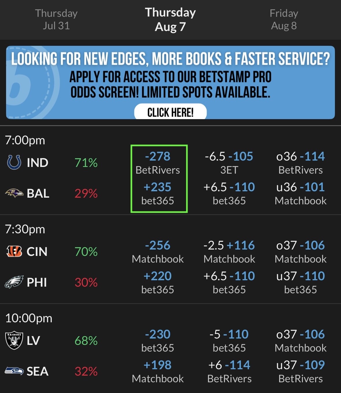 一切的根基。一般来说,在没有任何promo的情况下找到arbitrage的套利机会相当困难。举例今晚的NFL pre-season比赛: