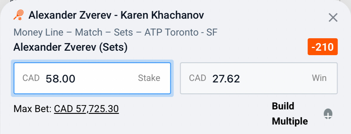 通常book会指定一个赛事,在所有此赛事的market上投注的赔率会有一定百分比的boost。这种promo一般会有最低赔率限制(e.g.,+100)。这里我们的策略就是将心仪的market(例如,在betstamp上拉一圈,看哪个market的对立面赔率和promo book绝对值接近)加上boost后进行pure arbitrage即可。以前两天的一场ATP Toronto比赛为例: