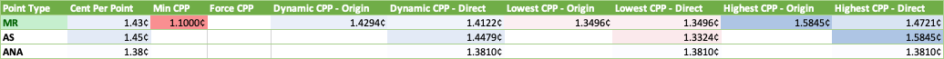 | Point Type | Cent Per Point | Min CPP | Force CPP | Dynamic CPP - Origin | Dynamic CPP - Direct | Lowest CPP - Origin | Lowest CPP - Direct | Highest CPP - Origin | Highest CPP - Direct |