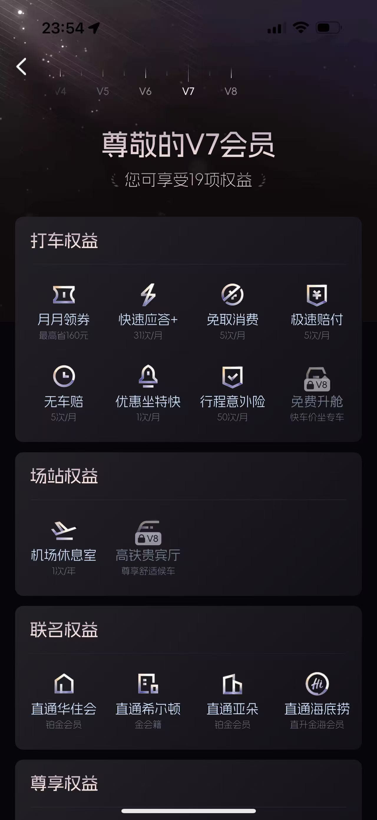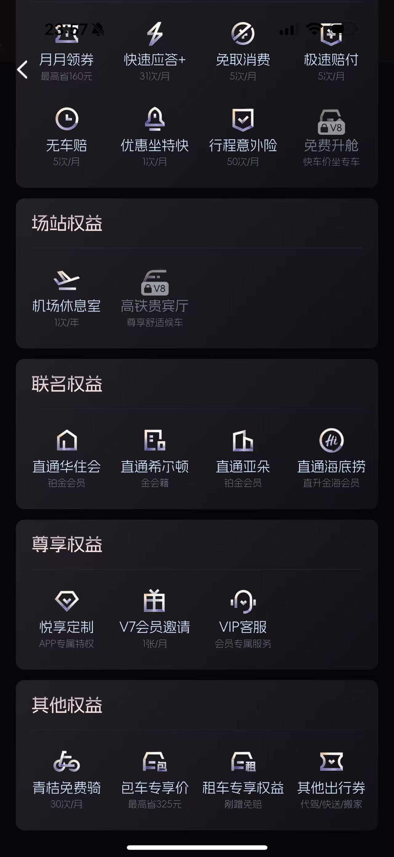 我手里的是AMEX Plat送的希尔顿金,能匹配滴滴V7,如果是钻石的话,能匹配到滴滴V8。不过V7和V8本身的福利相差不是特别大,无非V7权益的使用频率上限制比较大。V7每个月可以再送一个好友V7。