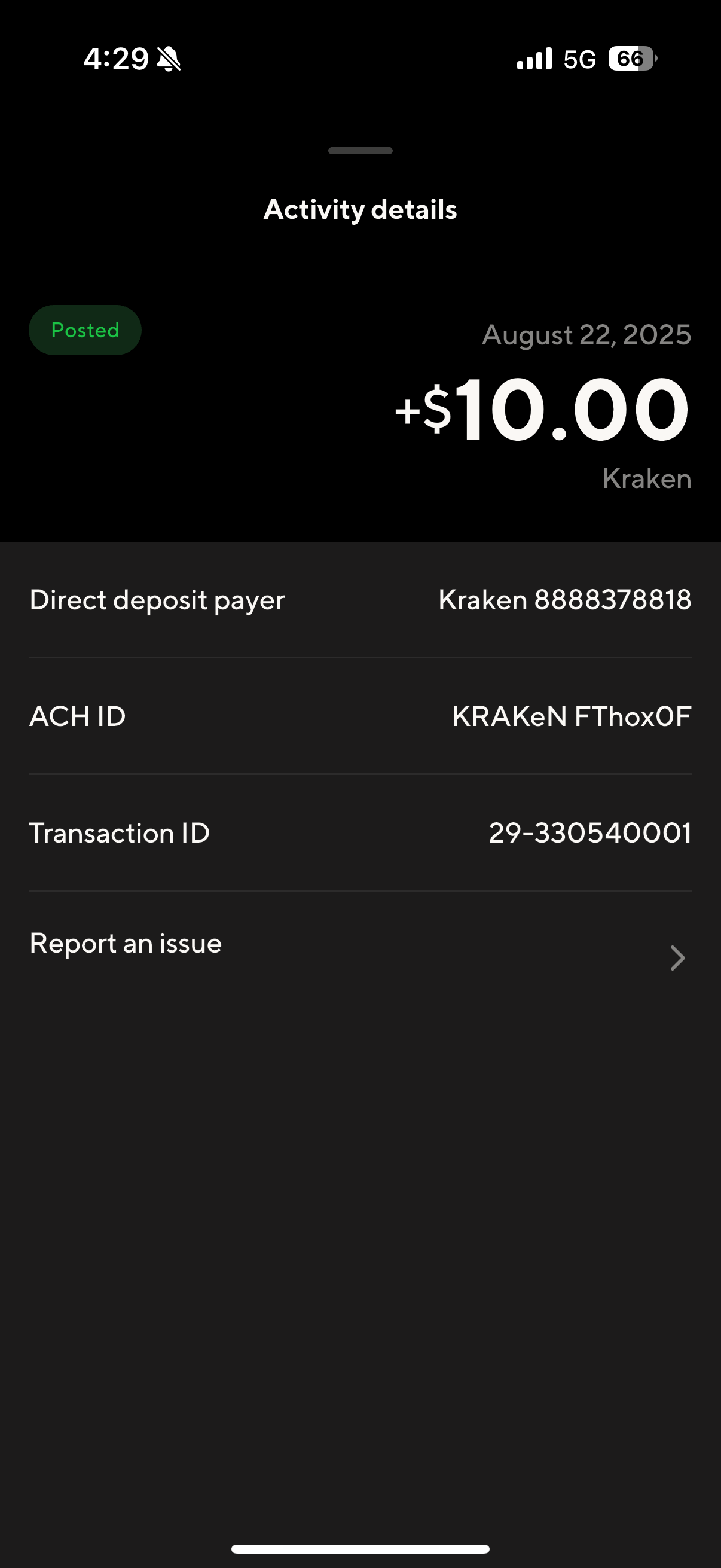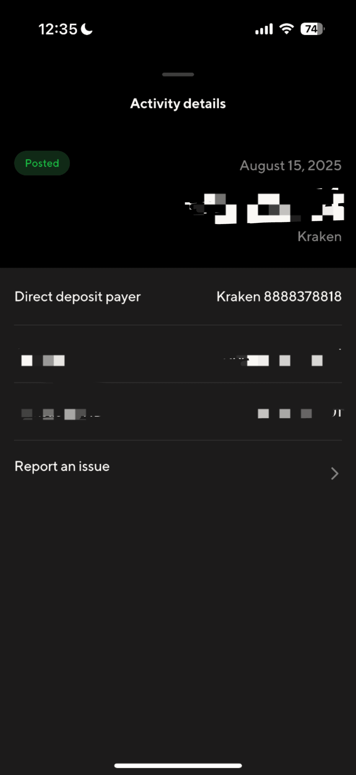 今天发现从Kraken转钱到SoFi账户上面算Direct deposit