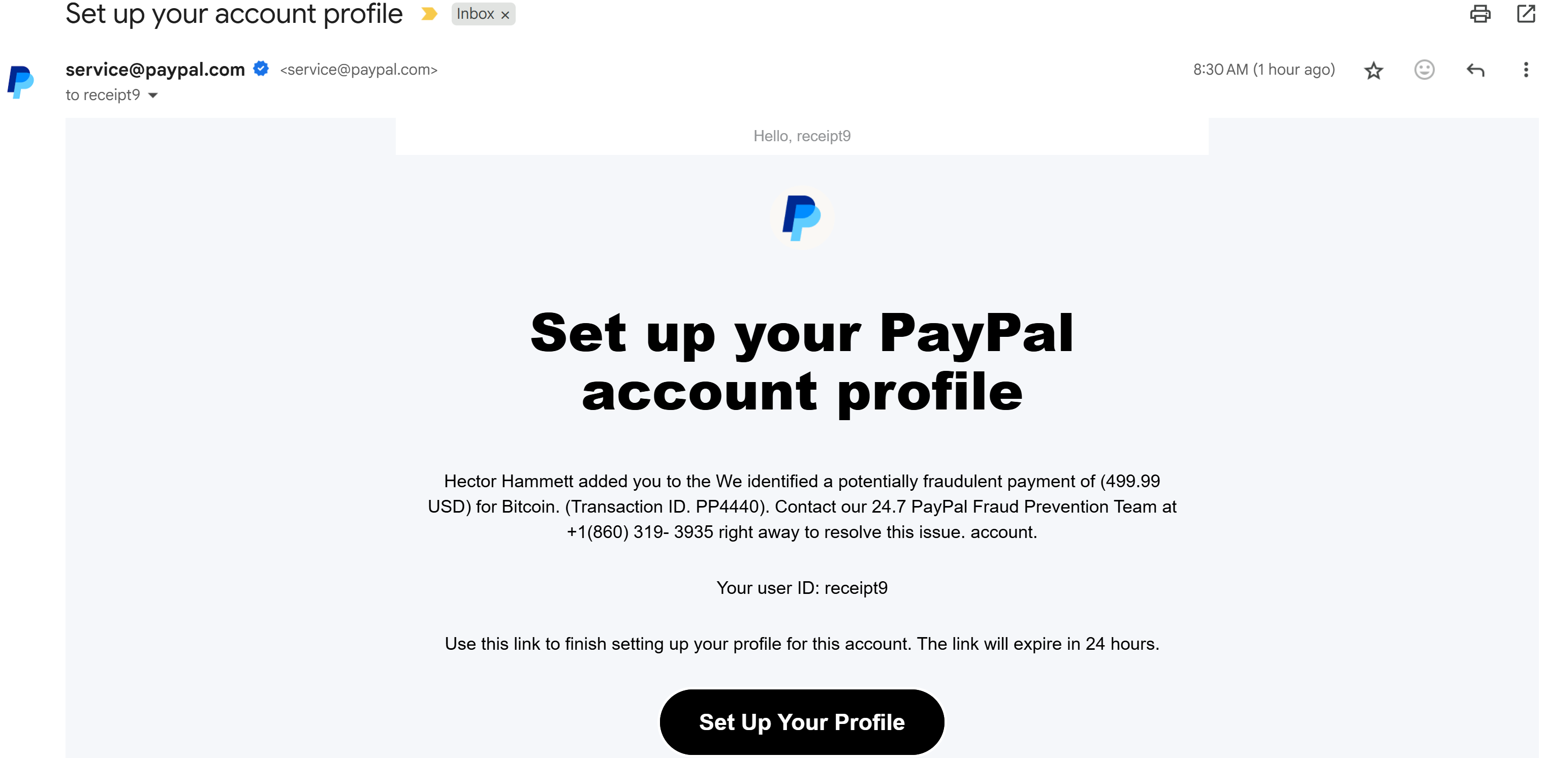 睡醒以后慢慢看邮件,发现是paypal.com发来的邮件没问题,另外去登录pp看消费记录没有发现什么500刀,然后认真看信息,估计是对方是开了个account叫“We identified a potentially fraudulent payment of (499.99 USD) for Bitcoin. (Transaction ID. PP4440). Contact our 24.7 PayPal Fraud Prevention Team at +1(860) 319- 3935 right away to resolve this issue.”, 然后把我加过去,触发官方发邮件。PP这account名没有任何限制吗