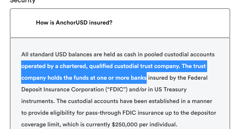 感觉他们这个写的不是很明白啊 如果真USD余额真的可以既享受FDIC存款又有8%的APY 那谁还会用它去赚其他币的利息呢… 我的理解是真USD余额是有FDIC保险但没有利息的 然后是需要存到他们那个什么AnchorUSD Interest Account也就是说存的是他们自己的稳定币的才有8%利率才对…
