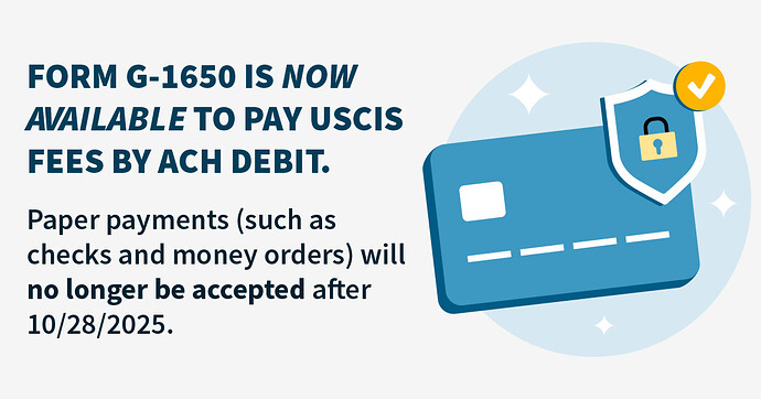 USCIS will continue to accept paper check and money order payments in addition to credit and debit payments until Oct. 28, 2025. After Oct. 28, USCIS will accept only ACH debit transactions using Form G-1650 or credit card payments using Form G-1450.