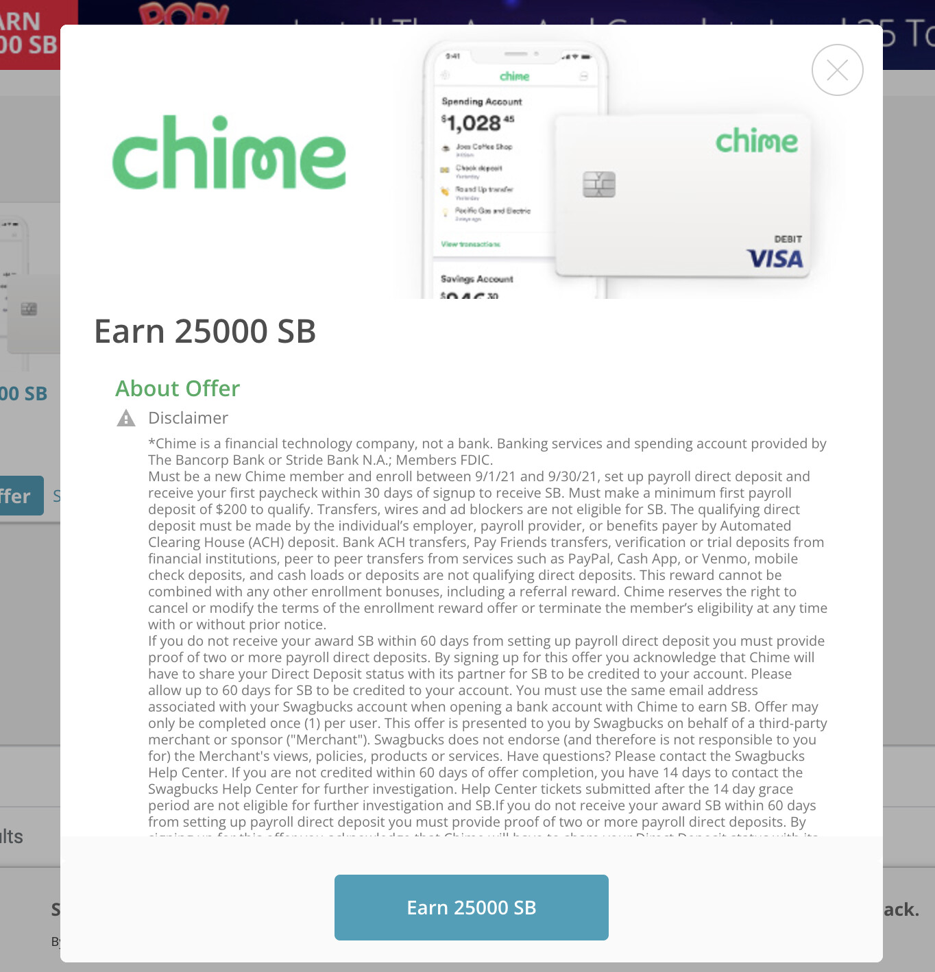 Must be a new Chime member and enroll between 9/1/21 and 9/30/21, set up payroll direct deposit and receive your first paycheck within 30 days of signup to receive Points. Must make a minimum first payroll deposit of $200 to qualify.