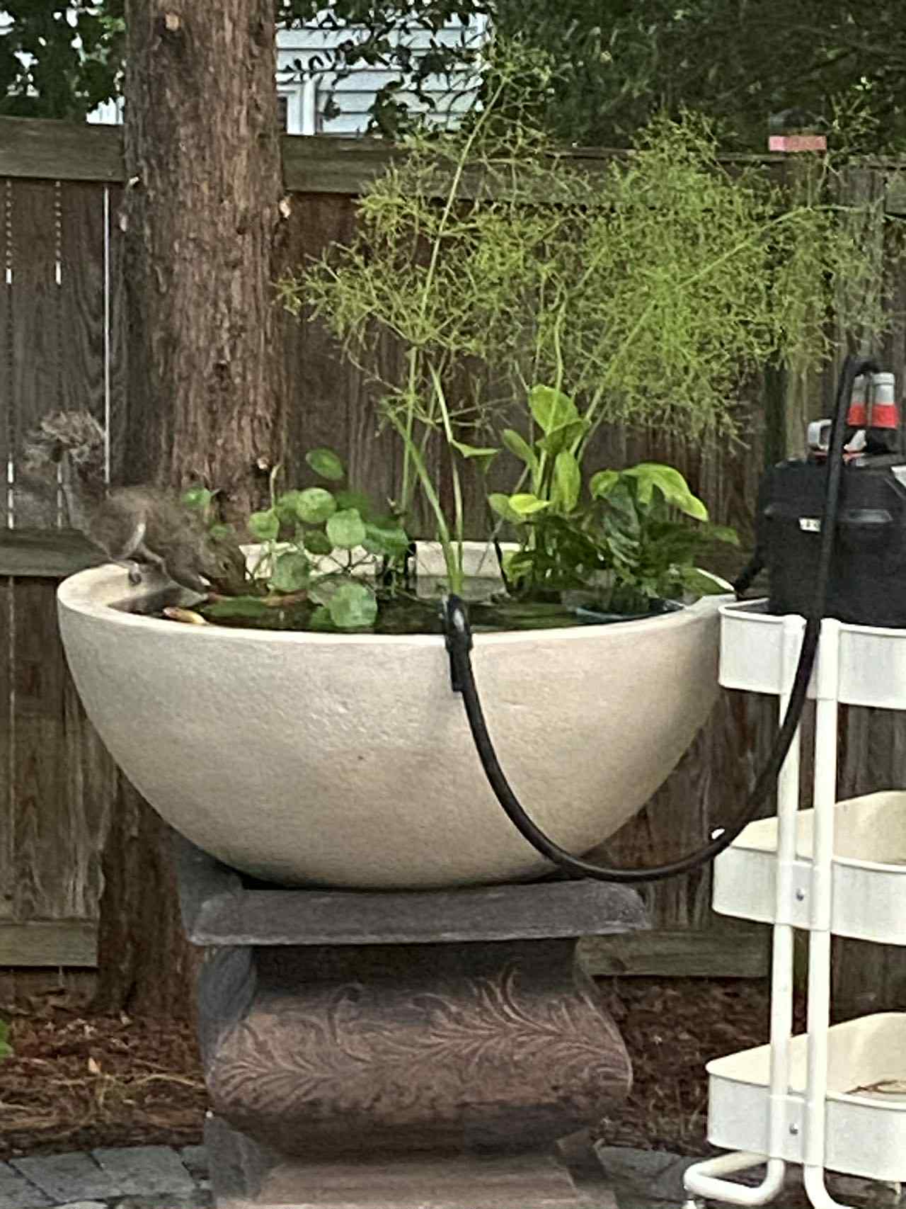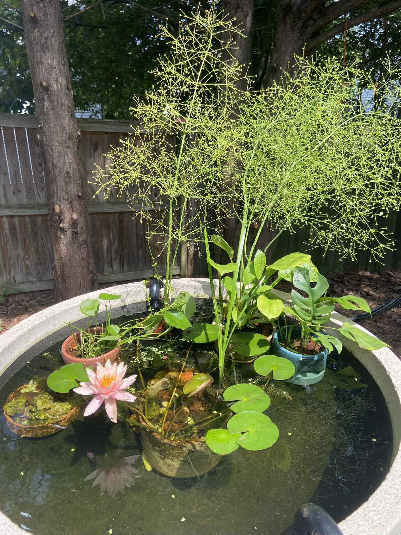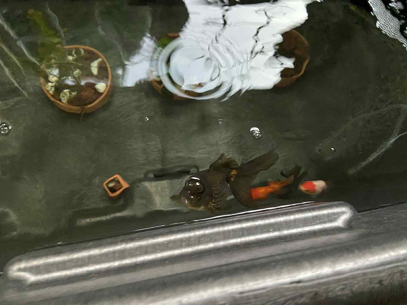 娃想要金鱼于是今年就新手上路了, 先开了口室外的, 后来天转凉了现在都移到室内一个water trough里了。里面有点金鱼, 观背,和白云金丝。也没照照片, 手机里就存了这么几个, 凑合看看图个消遣吧。