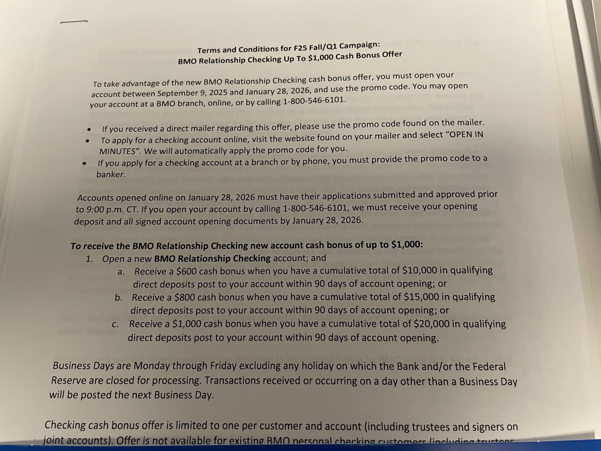 2025-09-09 去 branch 现场开卡,banker 电脑上可以验证 promotion code 有效,现场开需要 driver license,额外一张信用卡或者 debit card,然后存 25 刀到 relationship checking里,然后再给 4 张支票。