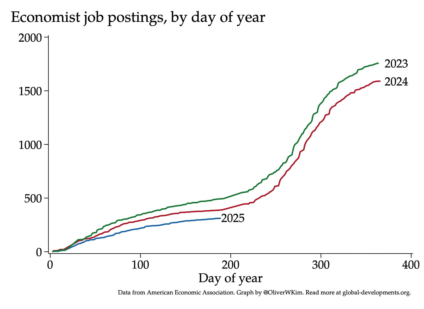 泥潭似乎有不少Econ或者商科PhD, 比如之前讨论的找工经验。又到了一年job market season,似乎随着高等教育整体的不确定性增加,今年的形势也不怎么乐观: