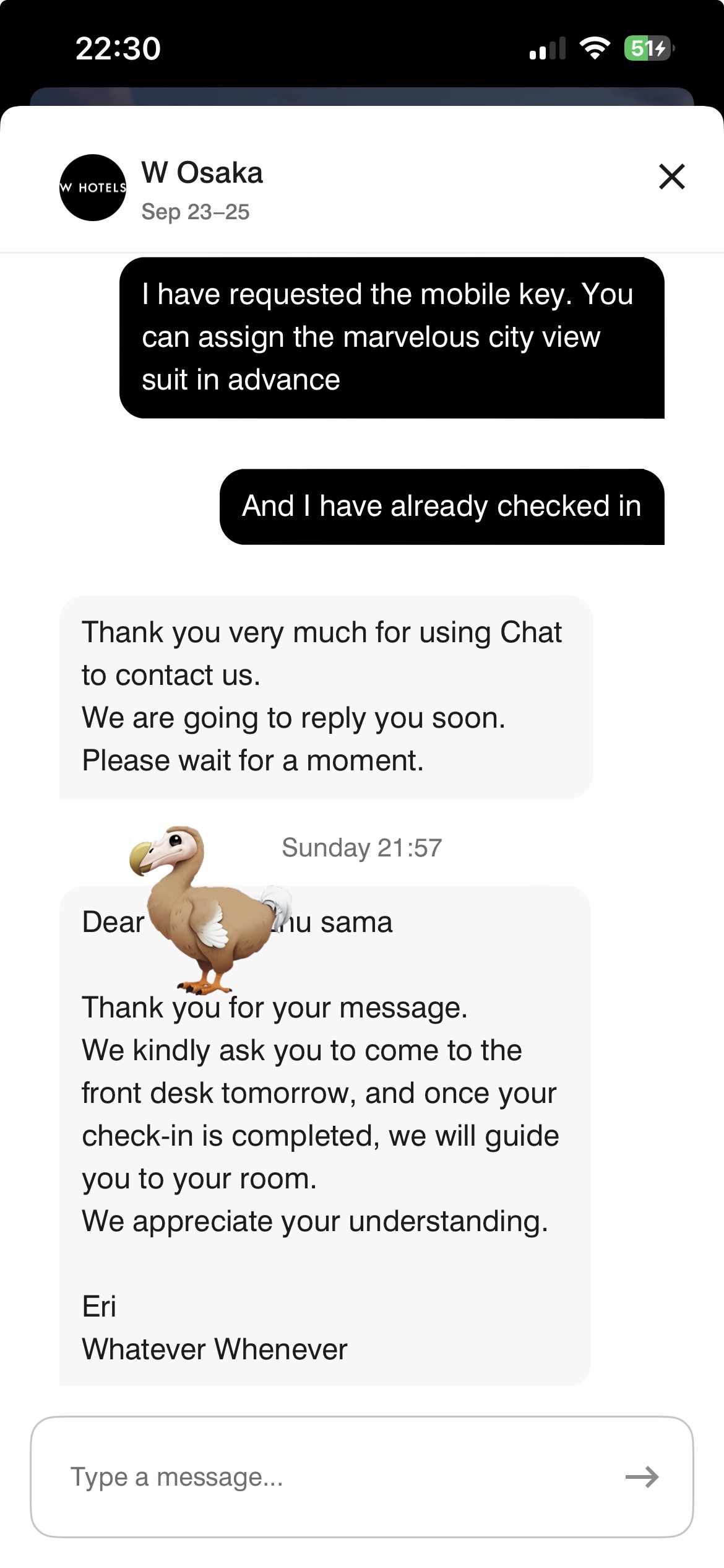 果然到的时候和我想的一样,说suit没了。我说我手机上看得到有房可以订,前台找了个人就帮我升了。不过是9楼