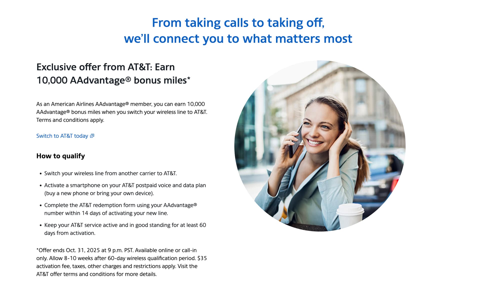 Qualification Process: Must order online at aa.com/att or by calling 833-995-2905. Customers who transfer their phone line and number from an eligible third-party carrier to AT&T (“port-in”) will earn 10,000 AAdvantage® bonus miles (“offer”). Excludes port-ins from Cricket and AT&T PREPAID. FirstNet and AT&T Business customers not eligible. Port-in with a temporary number is not eligible for this offer. New line must be activated on qualifying wireless service on a smartphone purchased on an AT&T Installment Plan, bought at full price (“No-Commit”), or bring your own compatible, unlocked smartphone (“BYOD”). To qualify for the offer, the new line must remain active with qualifying wireless plan for a minimum of 60 days from activation.
