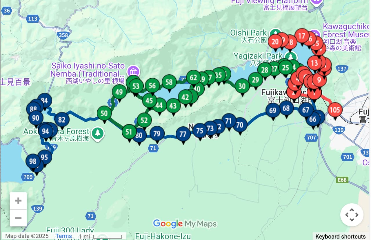 从这里回河口湖站费老劲了,山中湖这块公交并不多,晚了就更少了,google map上看的公交延误了很久,很冷