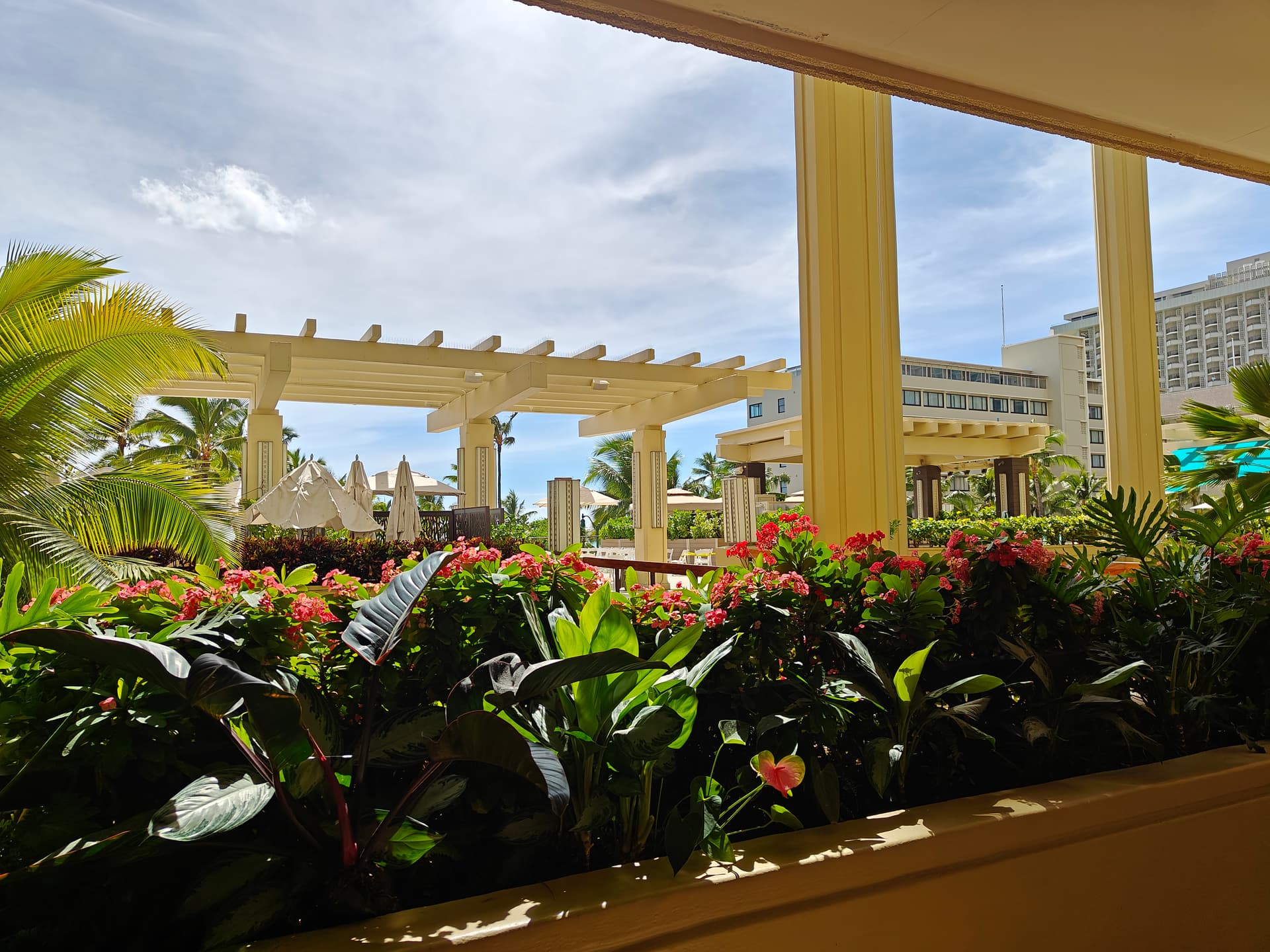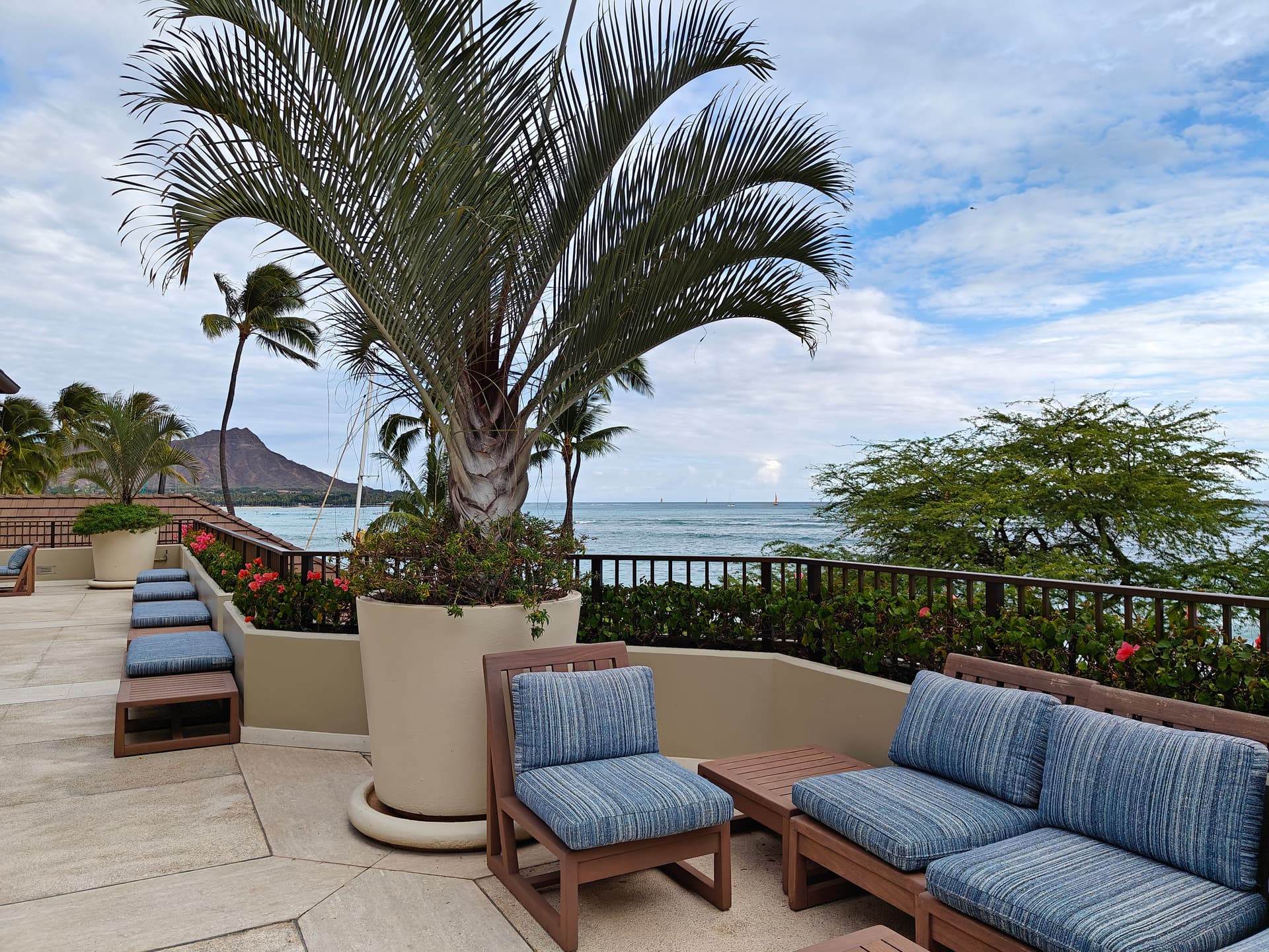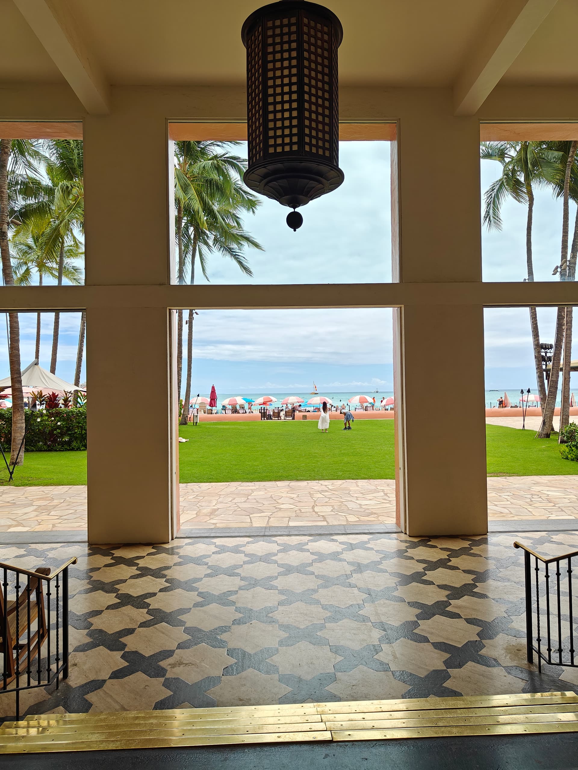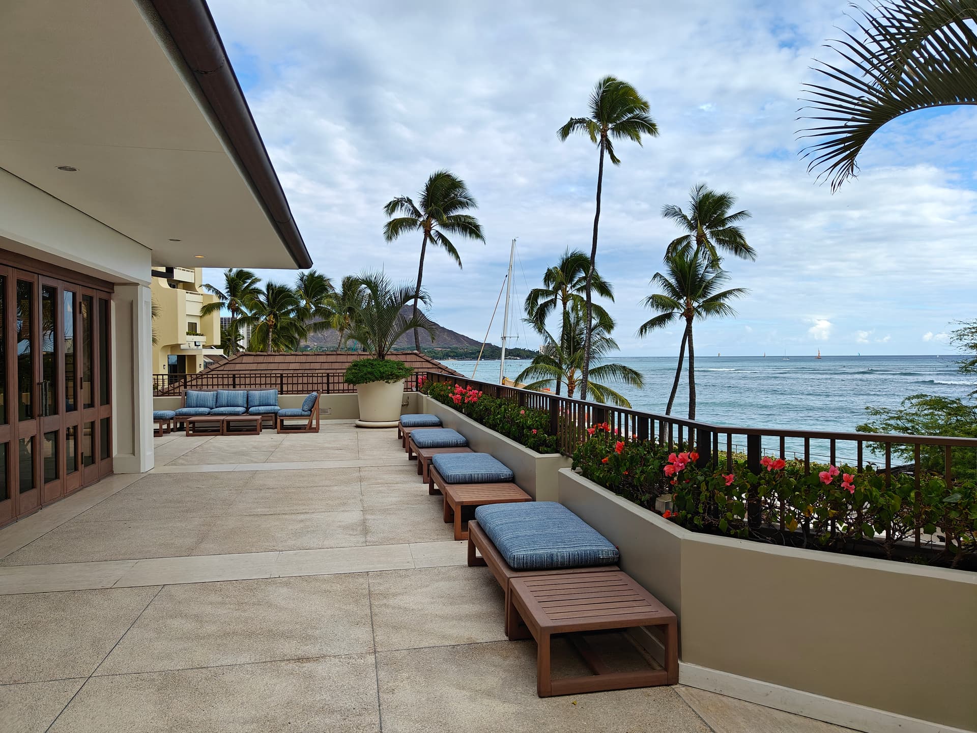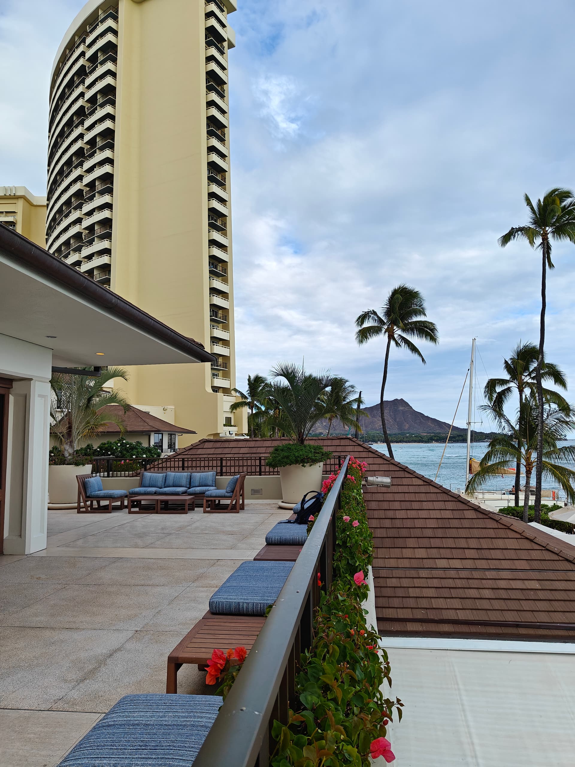 在一众奢华酒店缺席的热闹Waikiki,几个连锁集团集体都在以上千间房间的大卖场姿态摆烂,而四季这个水平的酒店都深谙segregation之道,不是开在私人岛上就是在Oahu的尽头 (Ritz Turtle Bay, Four Seasons Ko Olina, etc)。所以日本经济景气留下来的遗产,三菱不动产持有的Halekulani应该是Waikiki唯一勉强合格豪华酒店的选择了。酒店入口深藏在门庭若市的Waikiki中心,如果不是特地前往应该很难注意到这个外观毫无特点的物业。踏进酒店大门,看到的服务员比游客多,才能感受到这里确实是一个豪华酒店。