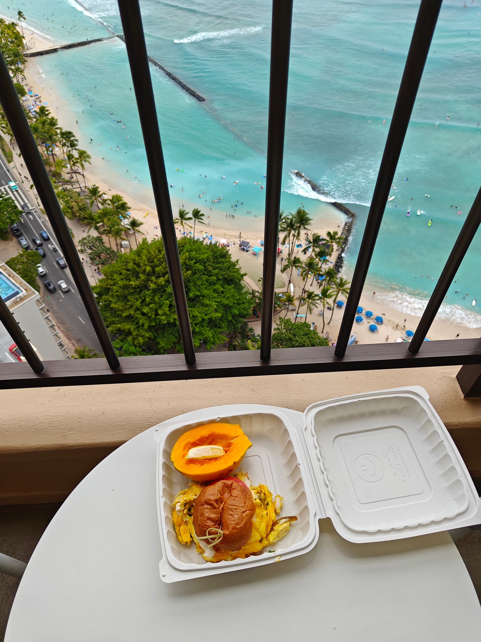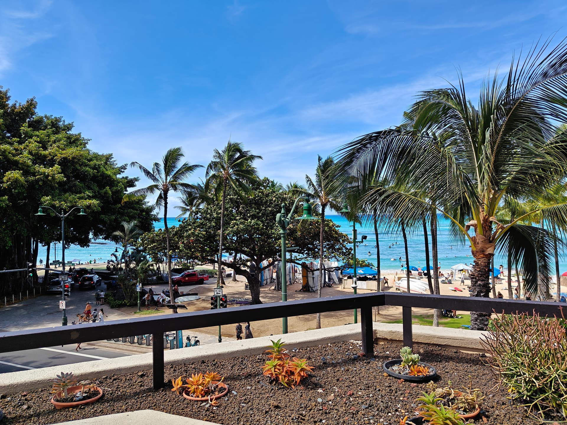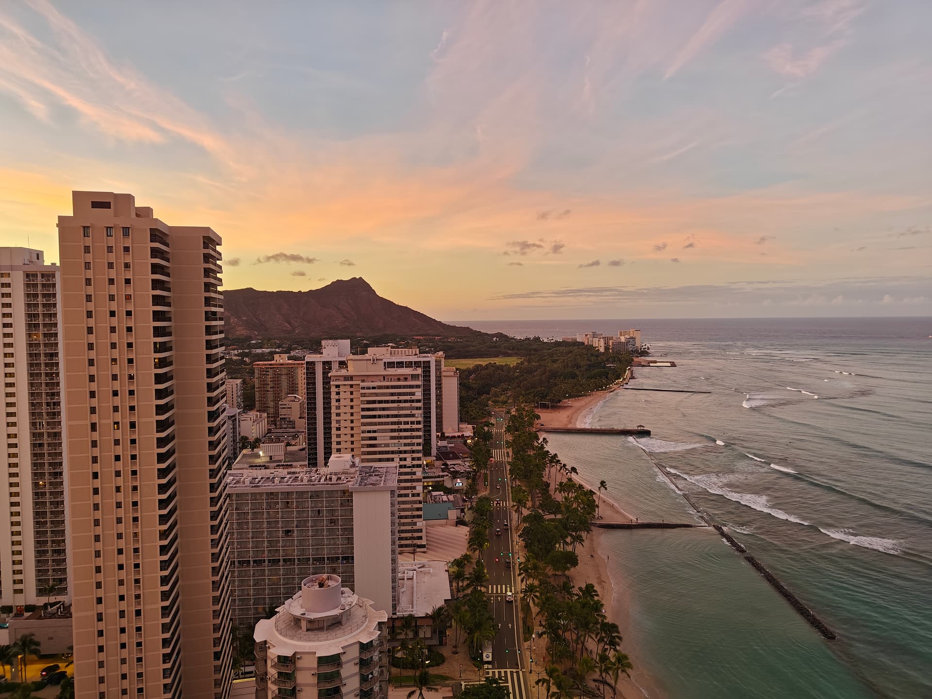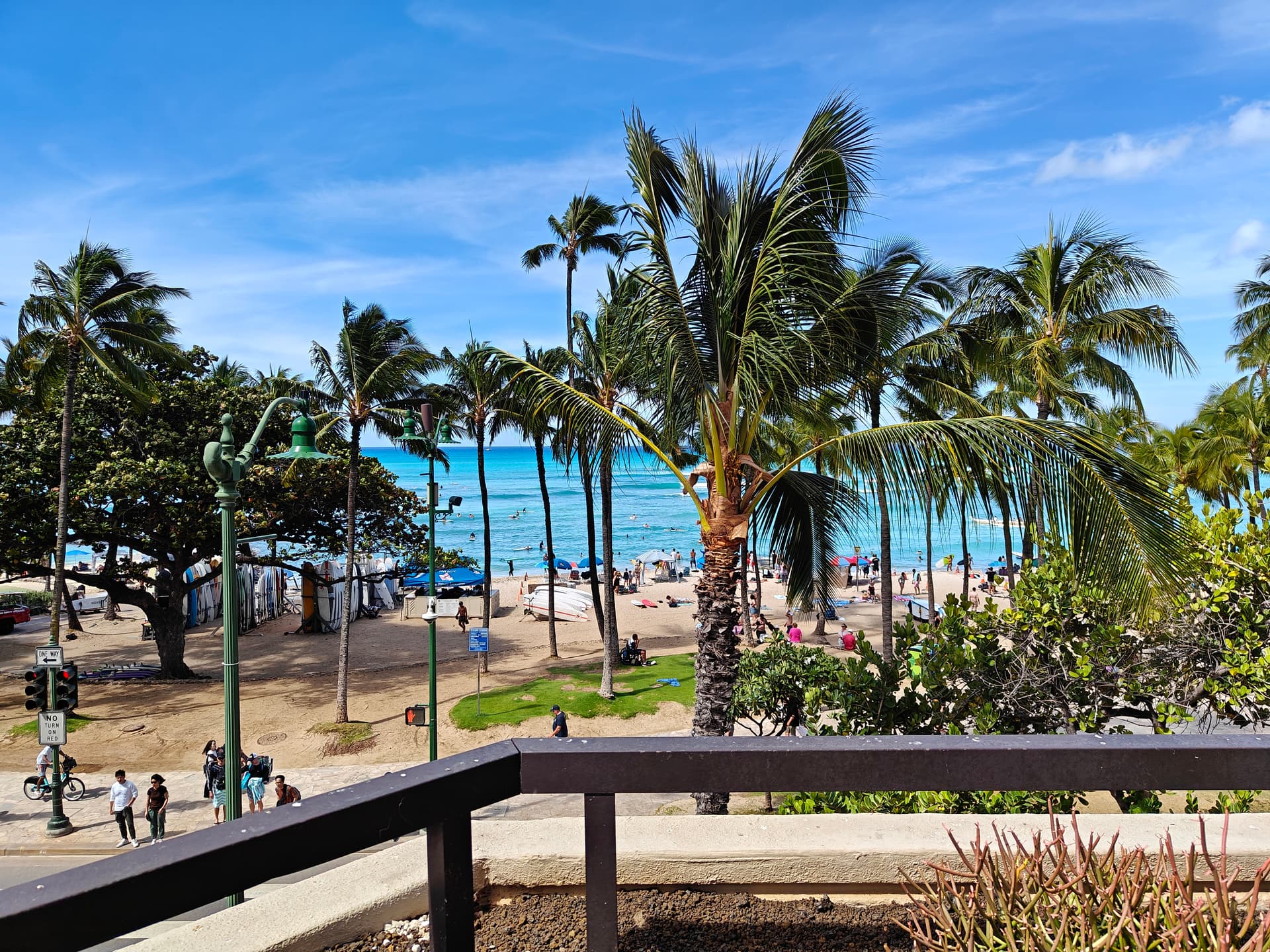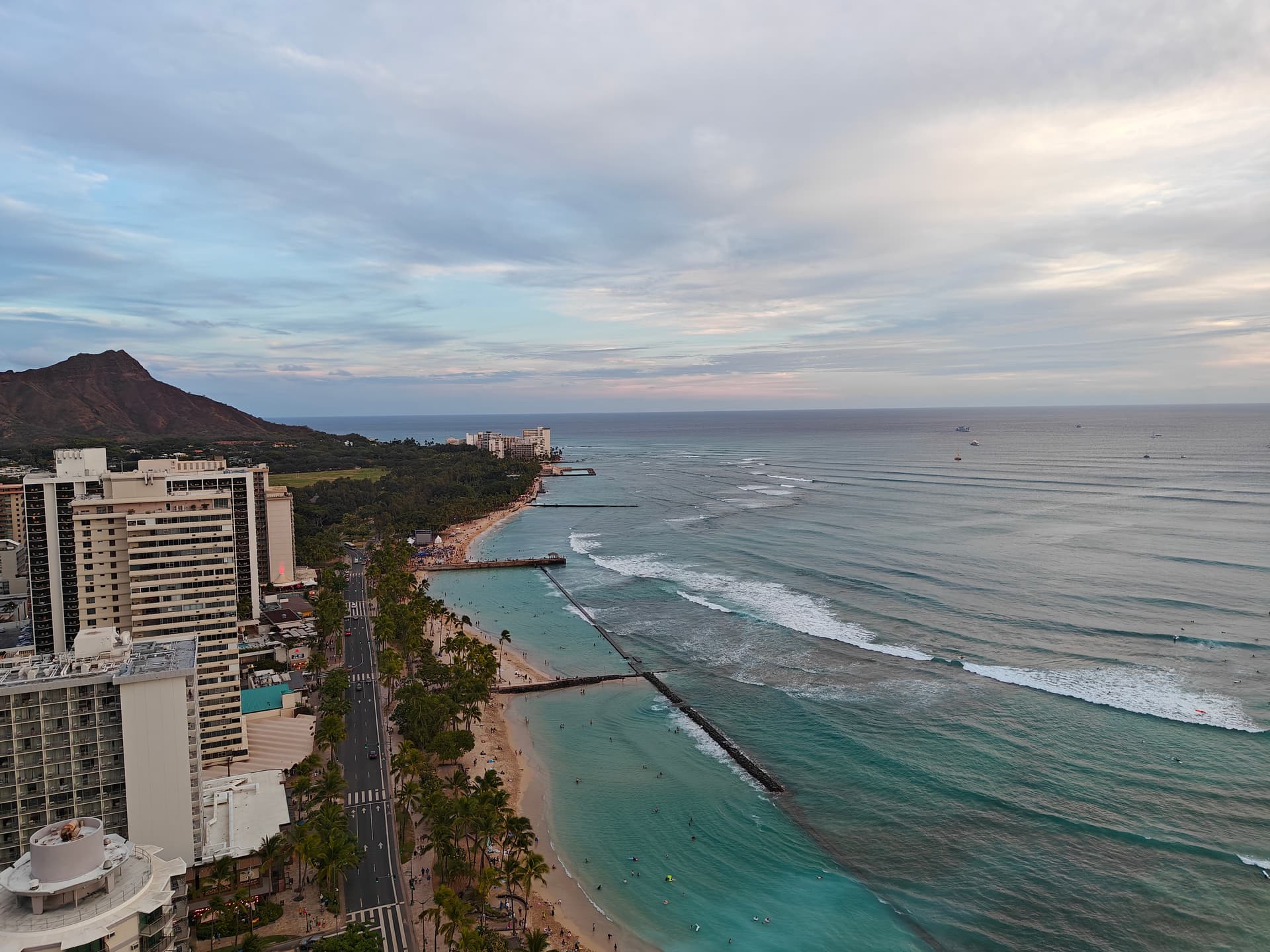 在一众奢华酒店缺席的热闹Waikiki,几个连锁集团集体都在以上千间房间的大卖场姿态摆烂,而四季这个水平的酒店都深谙segregation之道,不是开在私人岛上就是在Oahu的尽头 (Ritz Turtle Bay, Four Seasons Ko Olina, etc)。所以日本经济景气留下来的遗产,三菱不动产持有的Halekulani应该是Waikiki唯一勉强合格豪华酒店的选择了。酒店入口深藏在门庭若市的Waikiki中心,如果不是特地前往应该很难注意到这个外观毫无特点的物业。踏进酒店大门,看到的服务员比游客多,才能感受到这里确实是一个豪华酒店。