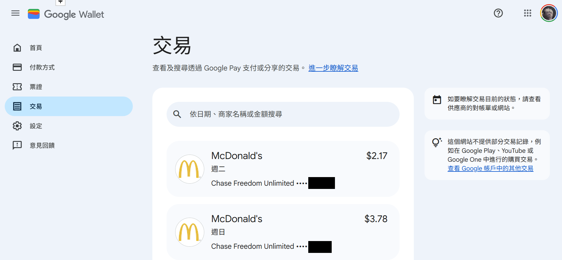 要看第三方得用google wallet,網頁版或者app。網頁版能一頁看到全部紀錄,app需要逐張信用卡點進去看。第三方交易比如用google pay在麥當勞app裡付款長這樣: