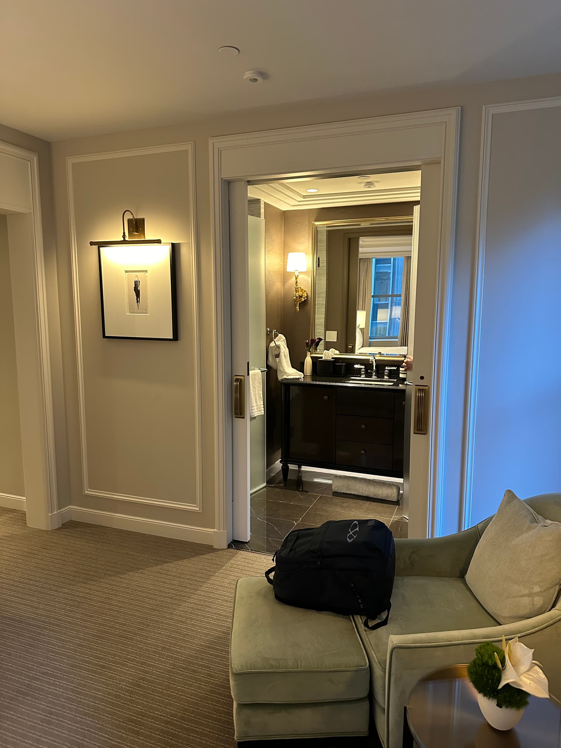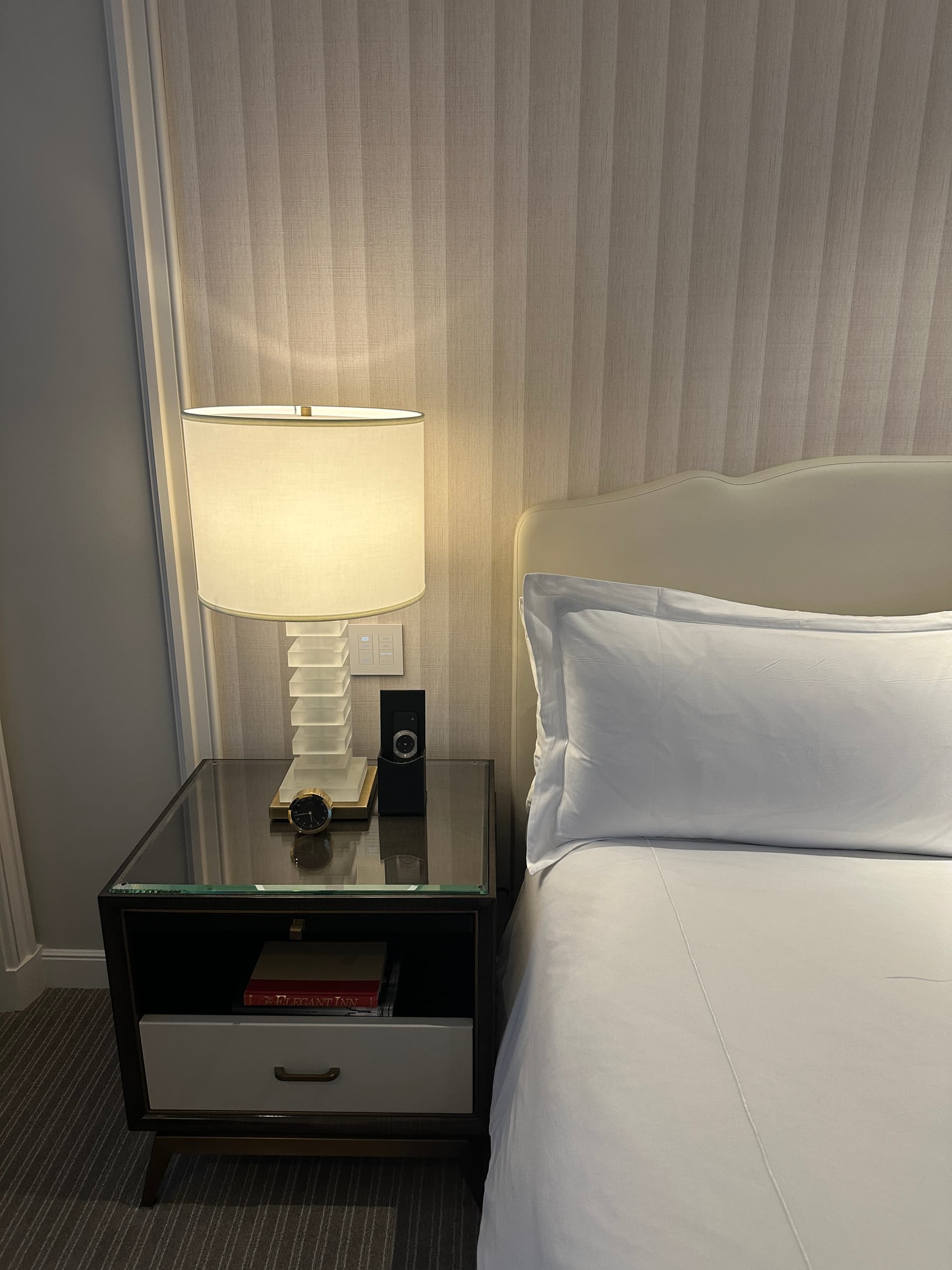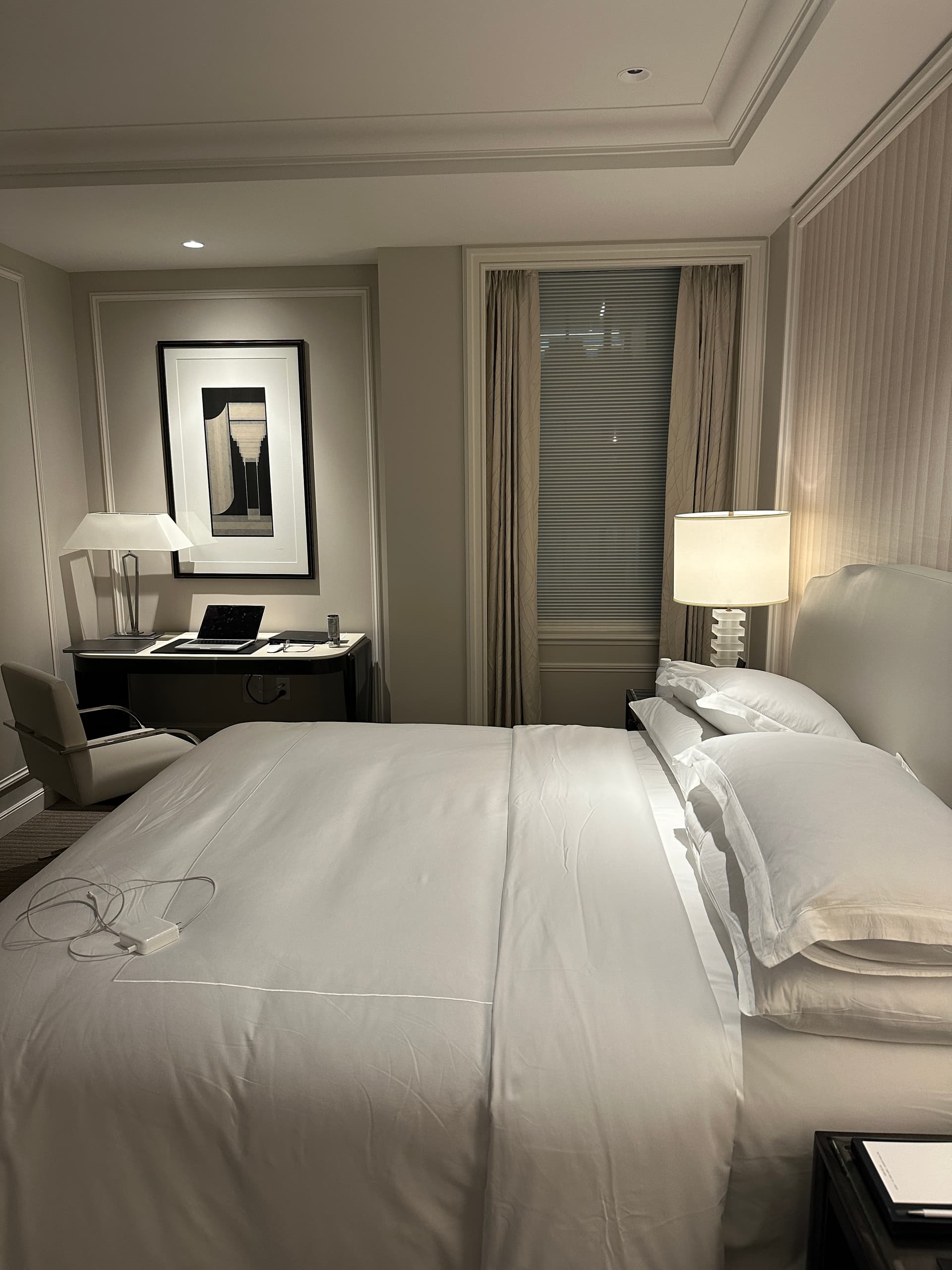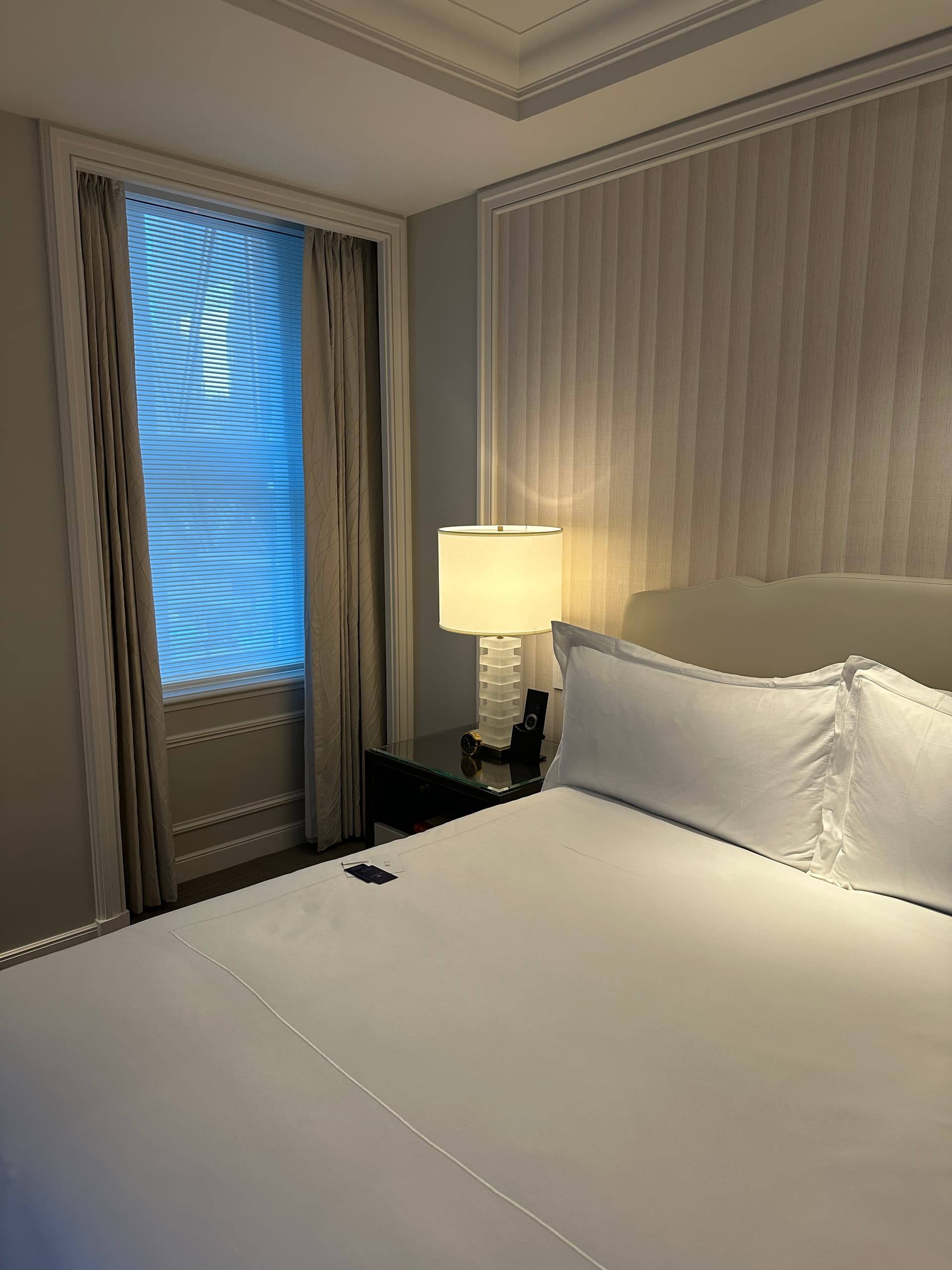 从豪华酒店标准来看,这个房间的硬装和软装都偏弱,不符合上海或北京华尔道夫入门级标准,我将它评为“Upper Upscale”级别。从装饰风格来看,墙面线条和壁纸暗示它属于2010年代的“过渡”风格。至于房间选择,如果需要换,可以考虑选择Junior Suite。