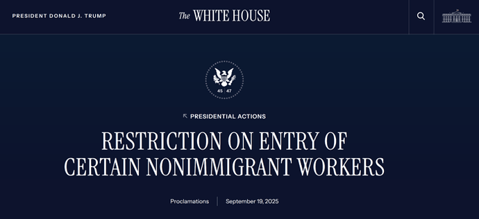 2025年9月19日下午约16:00 | 白宫正式发布总统公告,宣布限制某些非移民工人的入境。该公告规定,H-1B签证持有者在入境美国时,其申请必须附有10万美元的付款证明。此项限制自2025年9月21日东部夏令时凌晨12:01起生效。 | The White House |