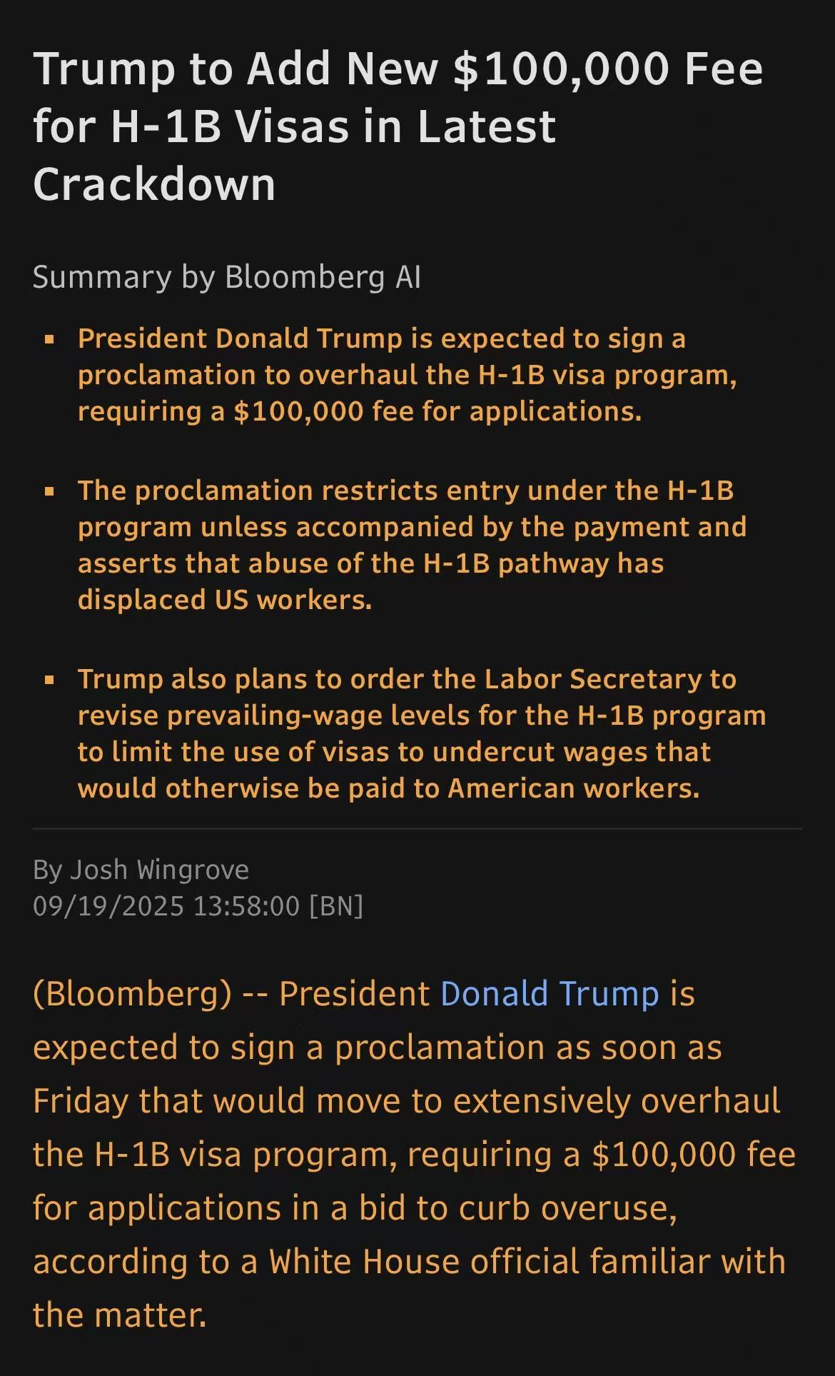 2025年9月19日上午10:58 | 彭博社首次报道,据白宫官员透露,时任总统特朗普预计最早于当天签署一项公告,对H-1B签证计划进行重大改革,要求申请者支付10万美元的费用。 | Bloomberg |