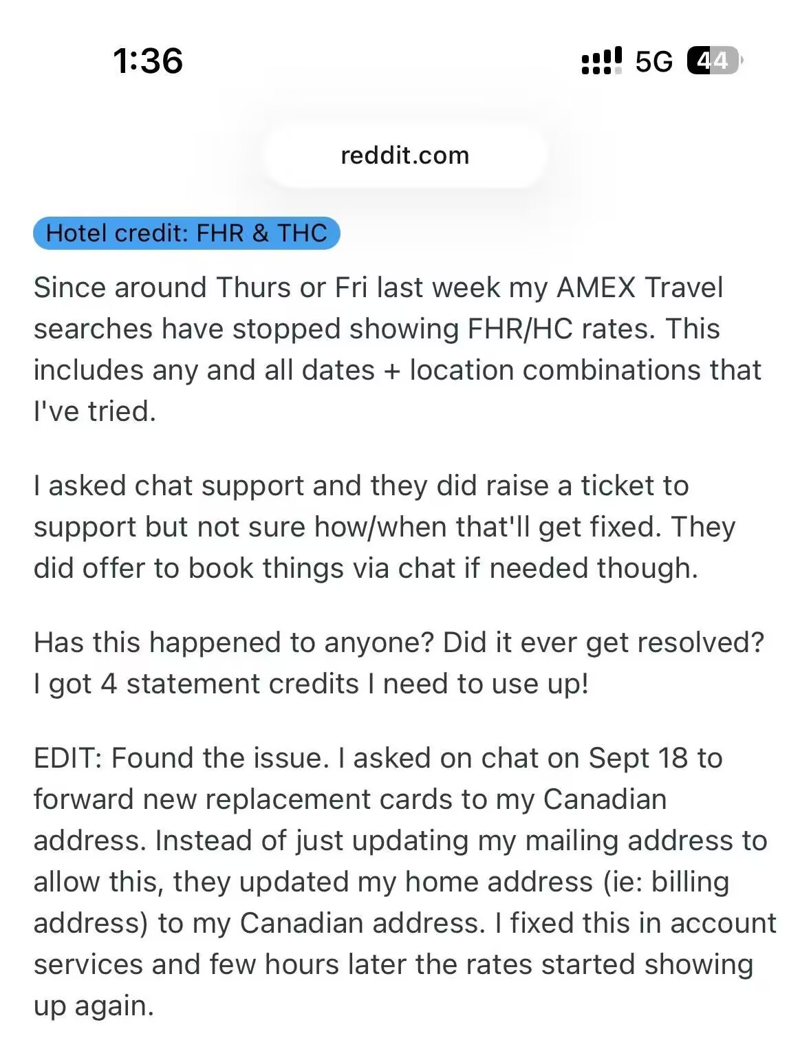 實測結論確實看不到 FHR 跟 THC 是因為加了 mailing address 的緣故,不知為何改版之後的系統會抓 mailing address 當 biling address 而不是 Home address