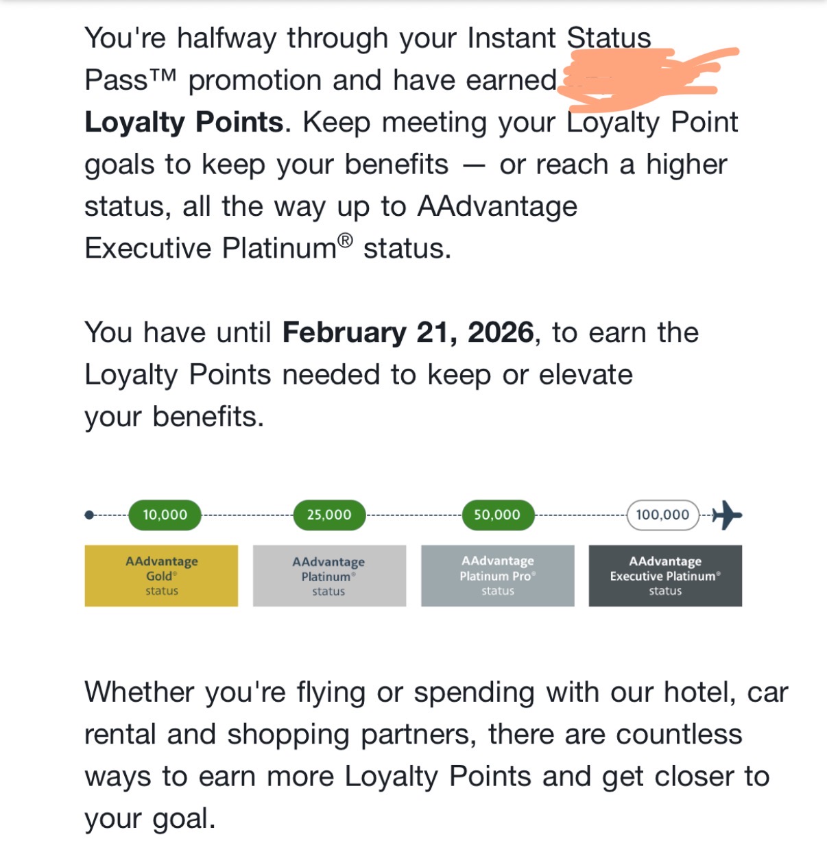 赞!查到了。 You have until February 13, 2026 , to earn the Loyalty Points needed to keep or elevate your benefits.
