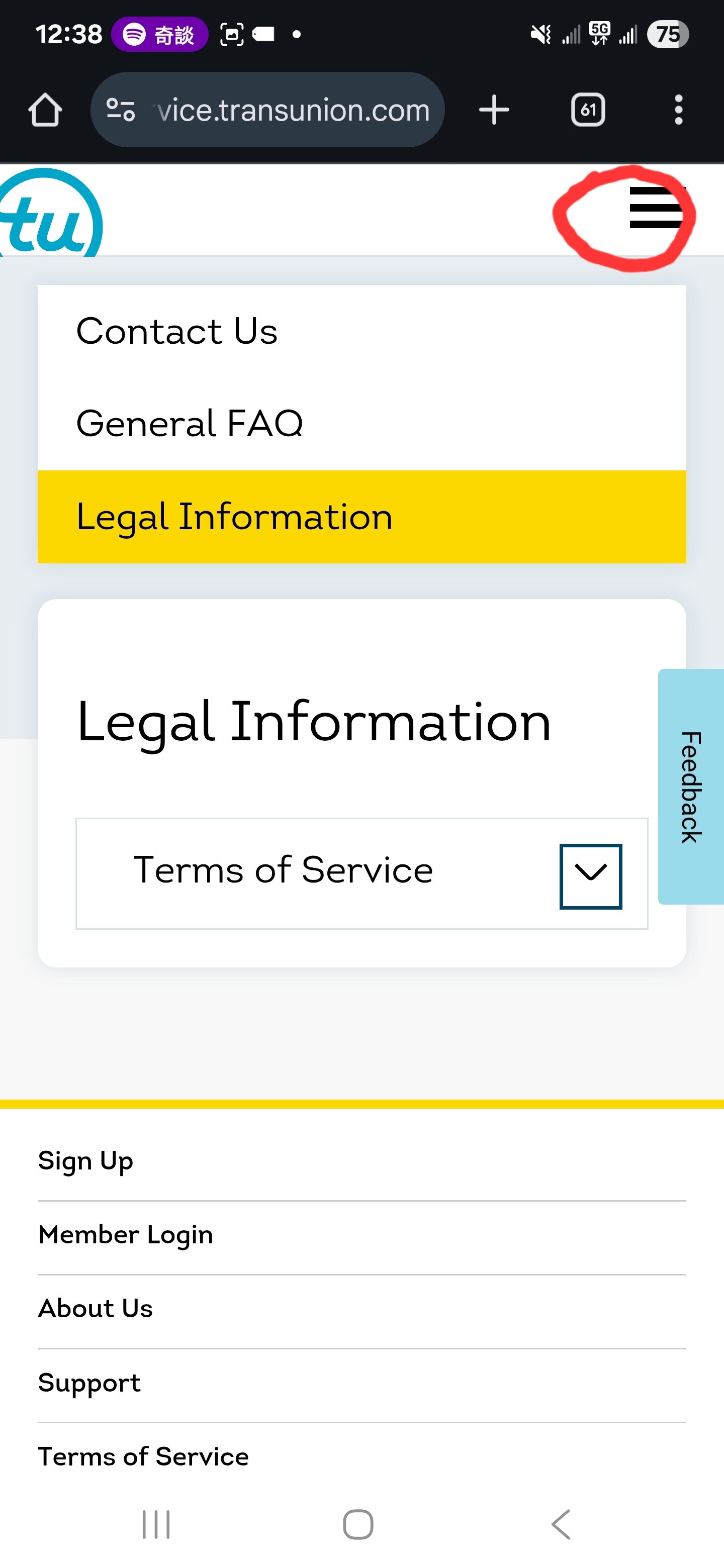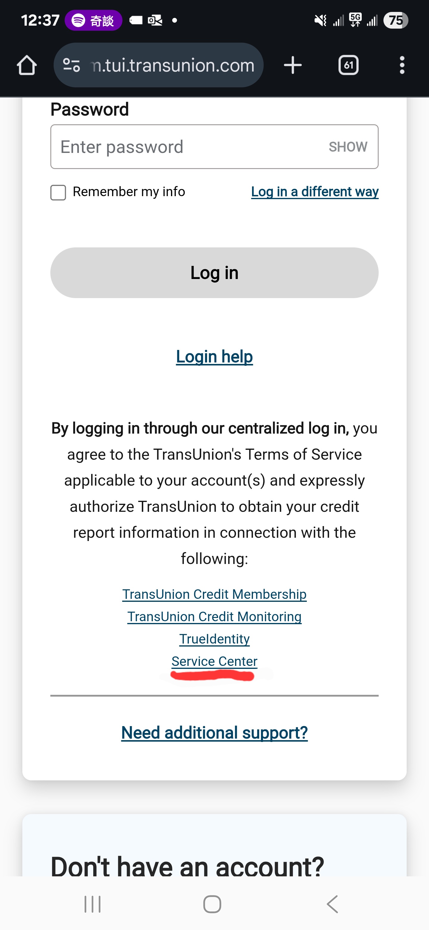 通过手机上的Chrome 浏览器进入 service.transunion.com