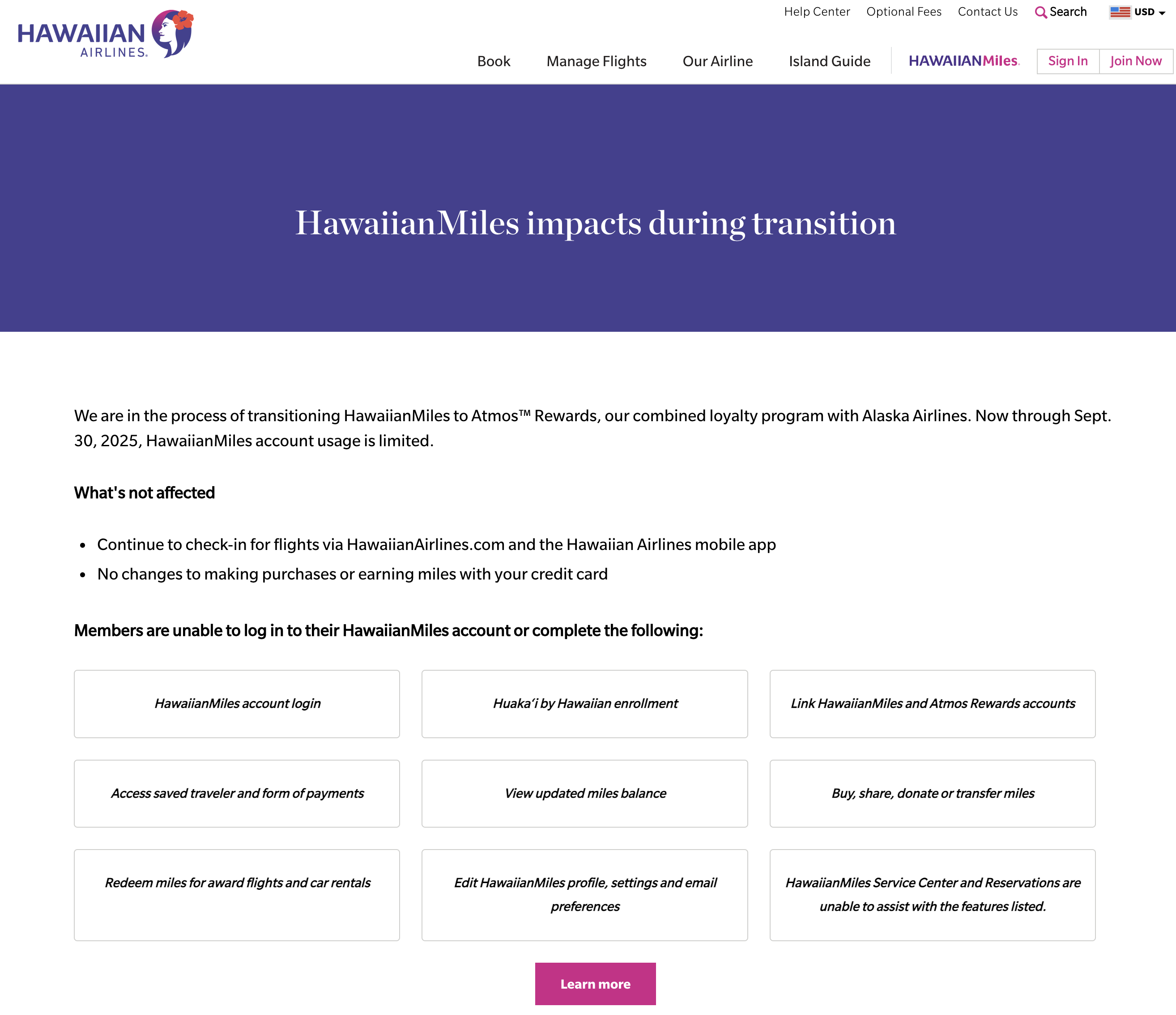 之前不是说9月30日-10月1日开始合并积分系统吗?早上打开alaska的app看到之前hawaiian信用卡开卡的积分已经转入了。查看hawaiian航空网站发现暂时无法登陆会员系统了。