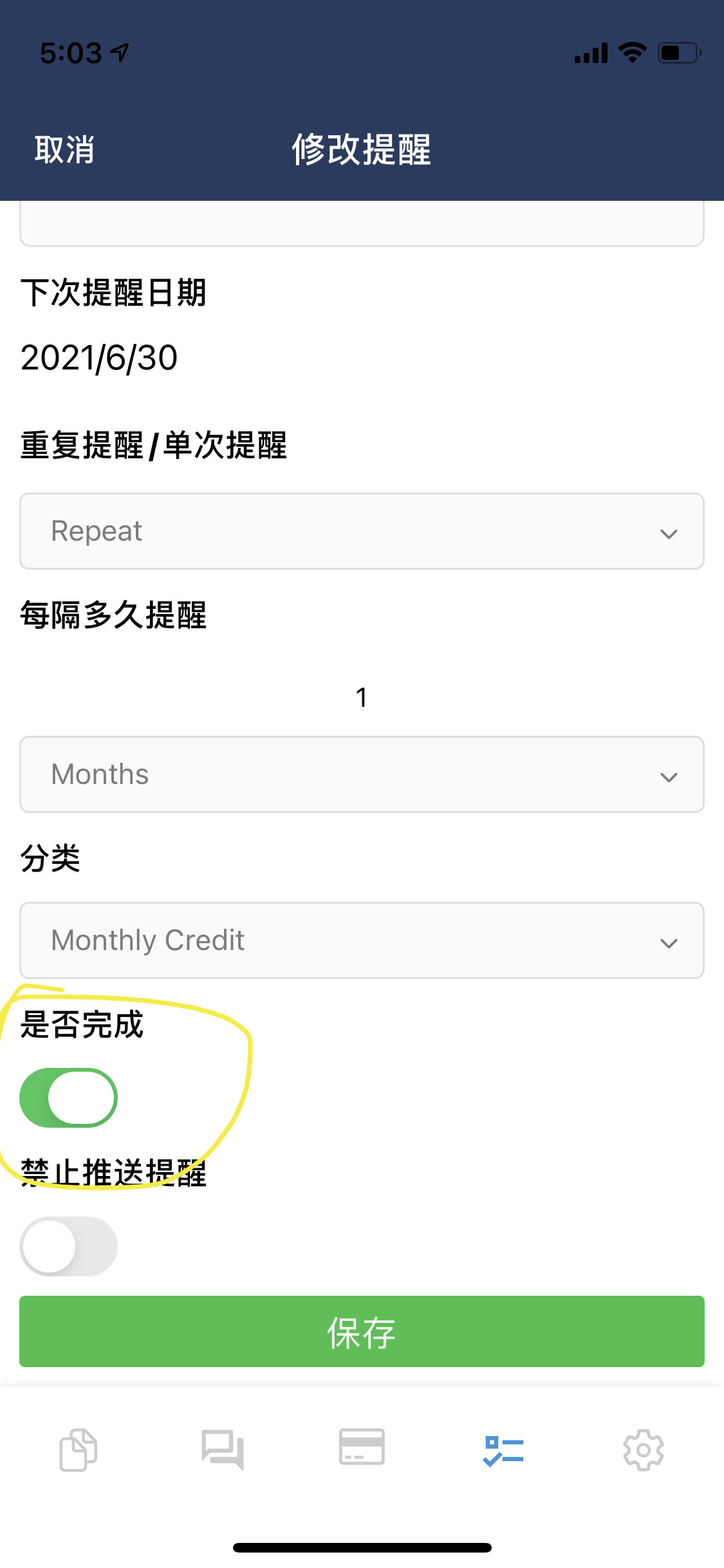 在推送列表页面 底部有个显示已完成的提醒事项按钮 点一下即可从那里找回来
