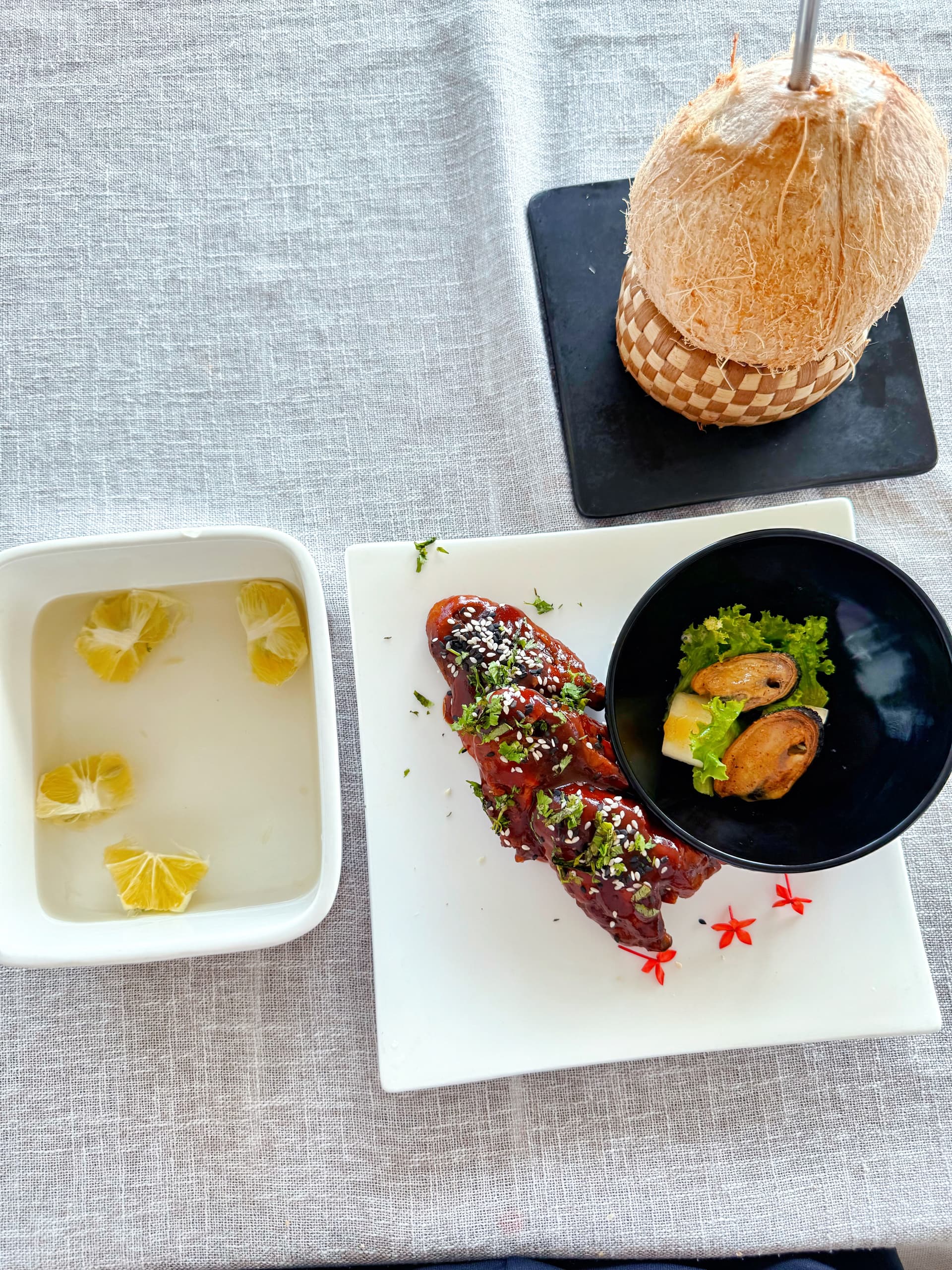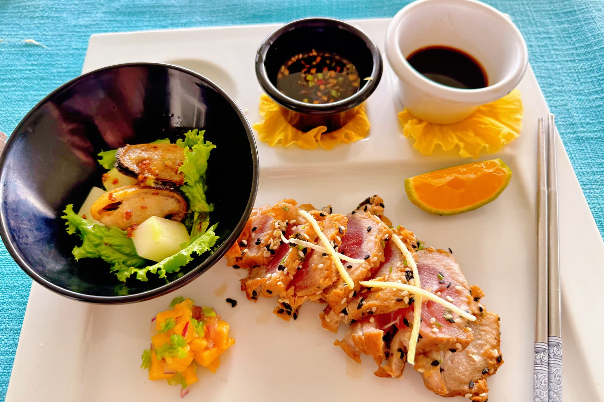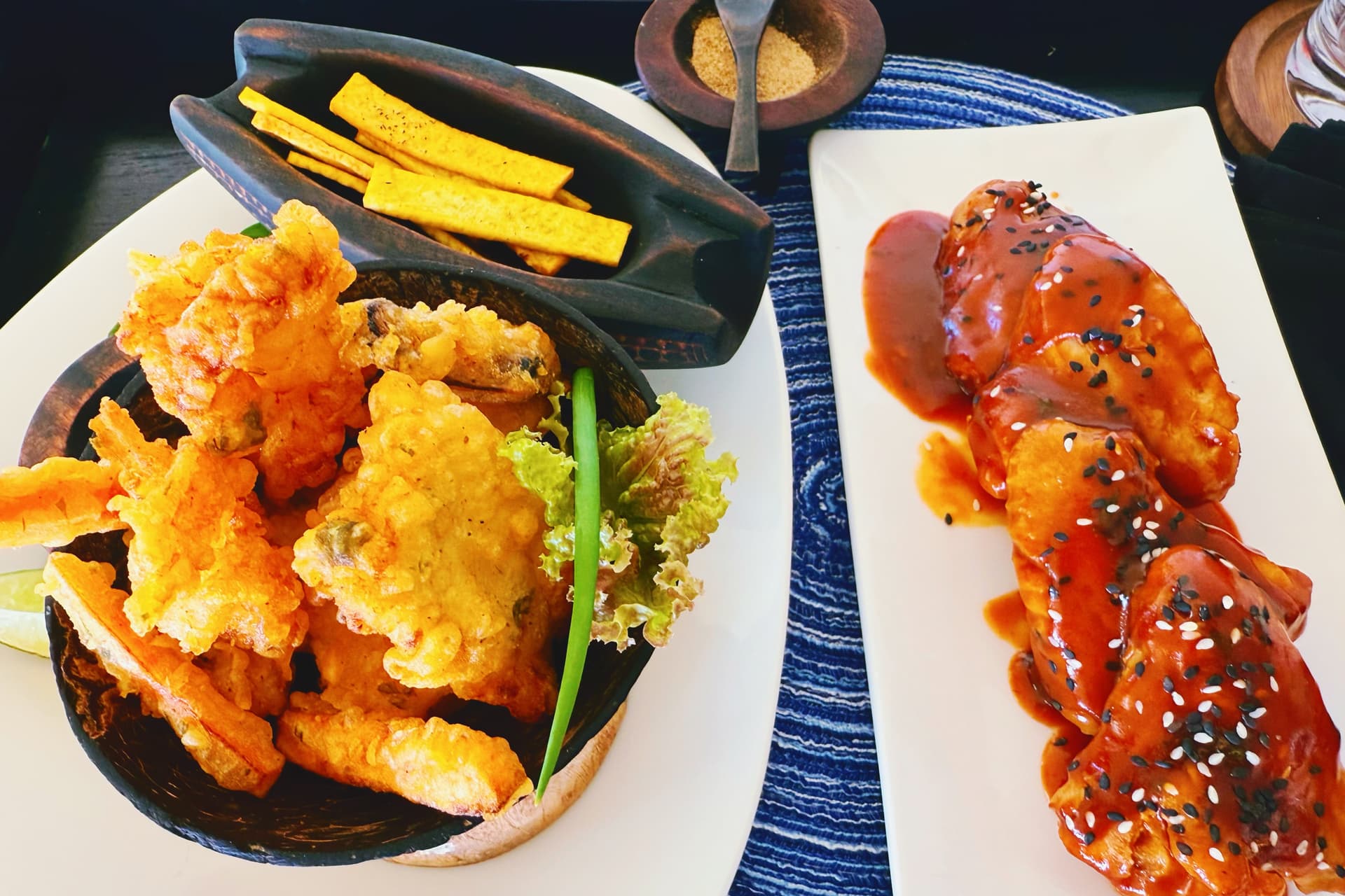 午餐多为清爽地道菜:椰汁烤鱼、辣味虾沙拉、木薯薯条。