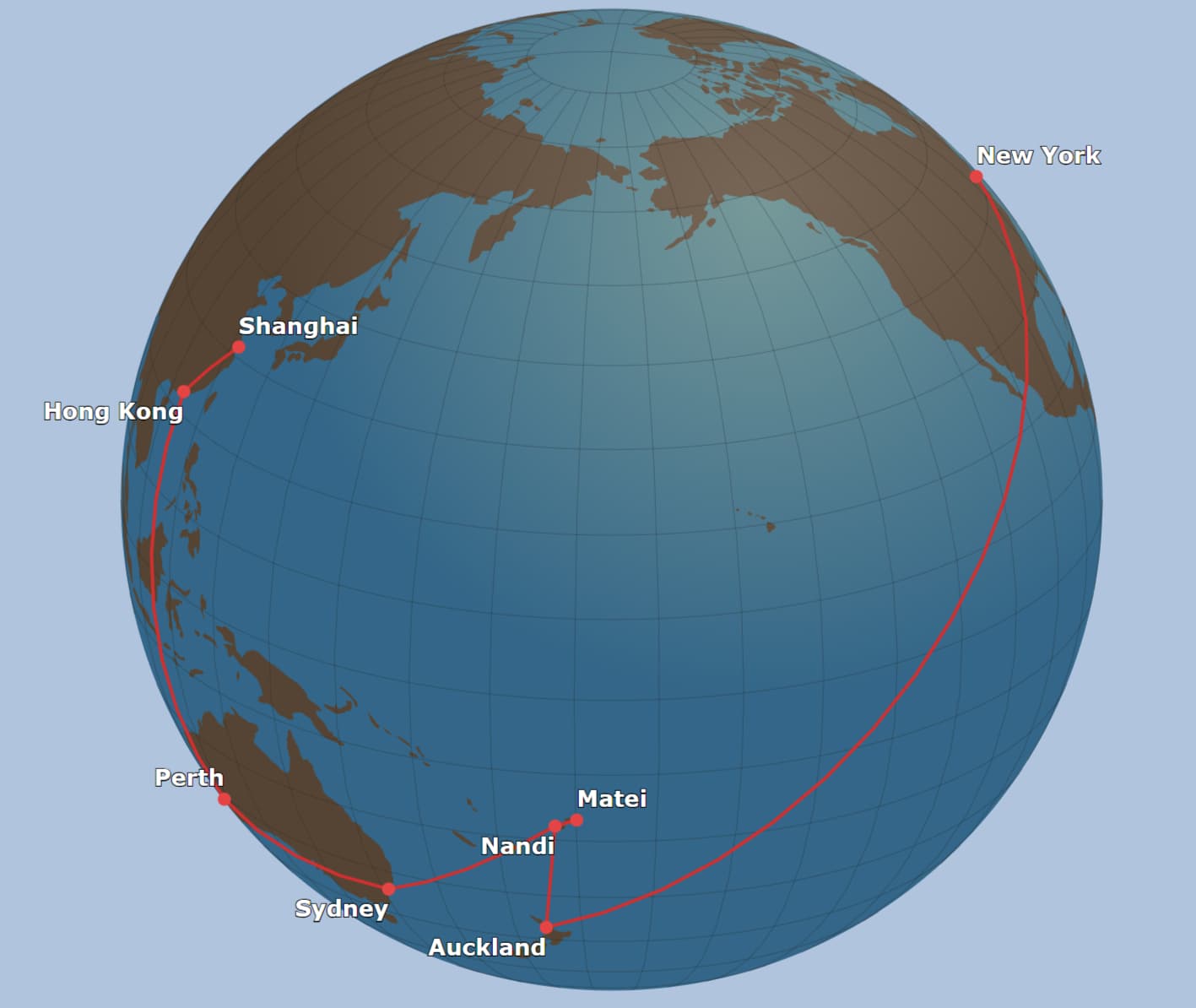 NAN -AKL-JFK:NAN-AKL是斐济航空商务舱,AKL-JFK是澳航商务舱第五航权,世界第2长航线,8,813 miles