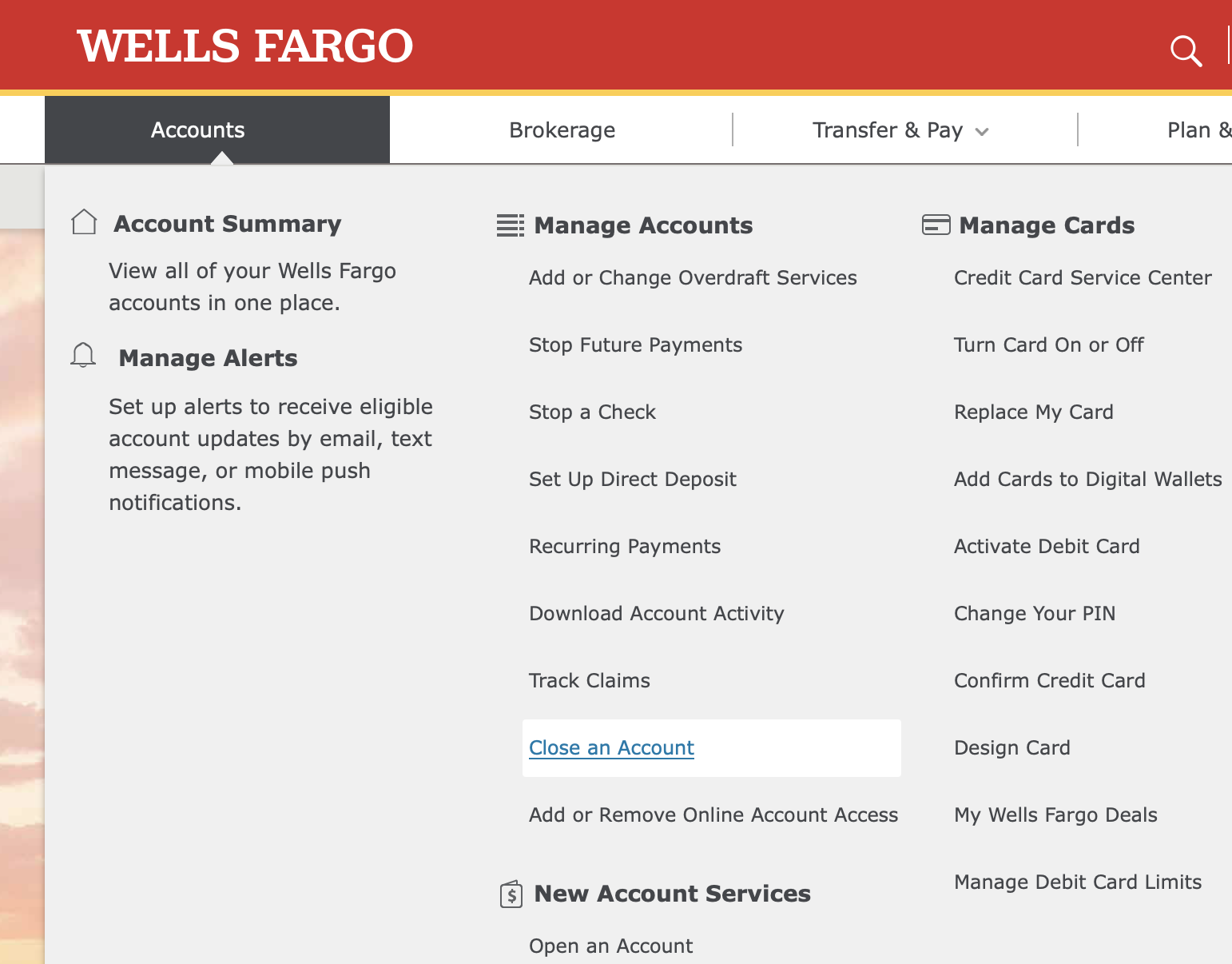 Wells Fargo 余额清空后可以在线关,否则要打电话