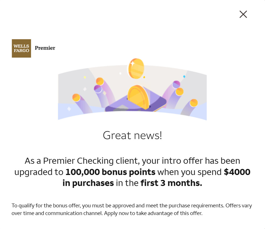 登陆Premier Checking account 后再申请Wells Fargo Autograph Journey Visa card应该也能看到10,000点的bonus offer