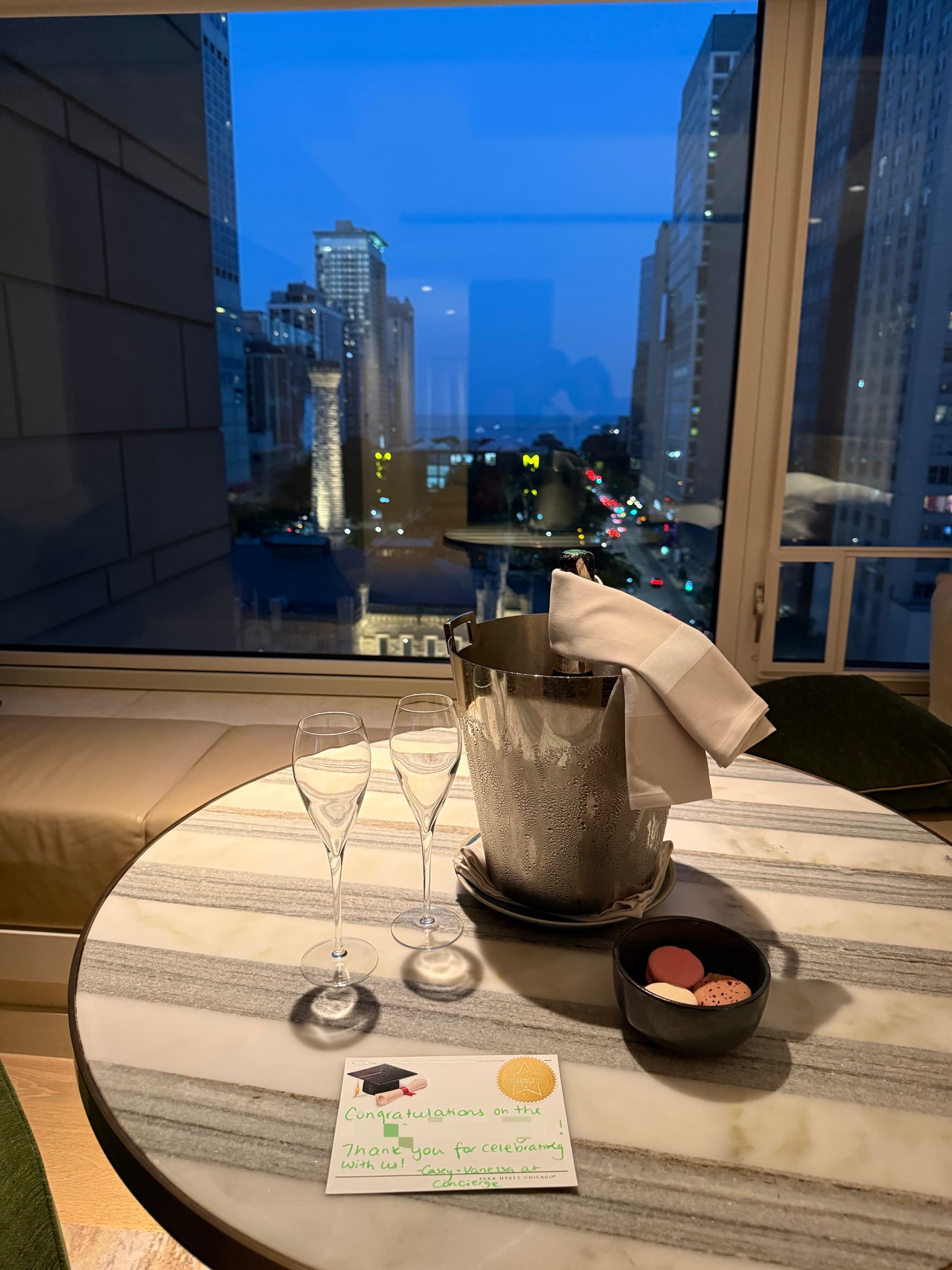 周六搬去柏悦,提前回复了酒店问候邮件,说明了在庆祝什么(毕业,然后酒店欢迎礼居然准备了三个马卡龙和一瓶香槟