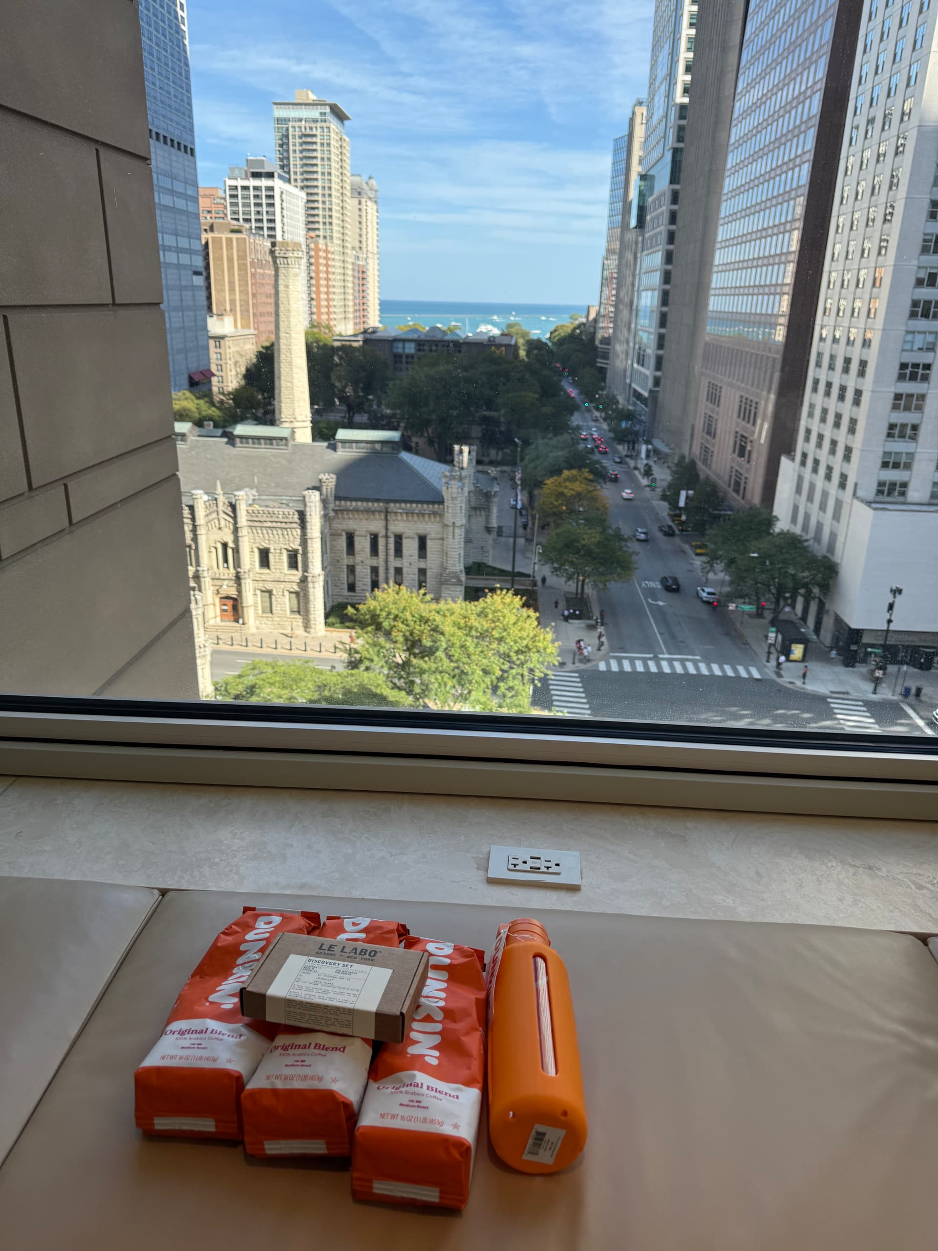 接下来搬去了HR Chicago,这是一个巨大的会议酒店,可能有几千间房,提前一晚给酒店发短信要升级河景套房,秒答应