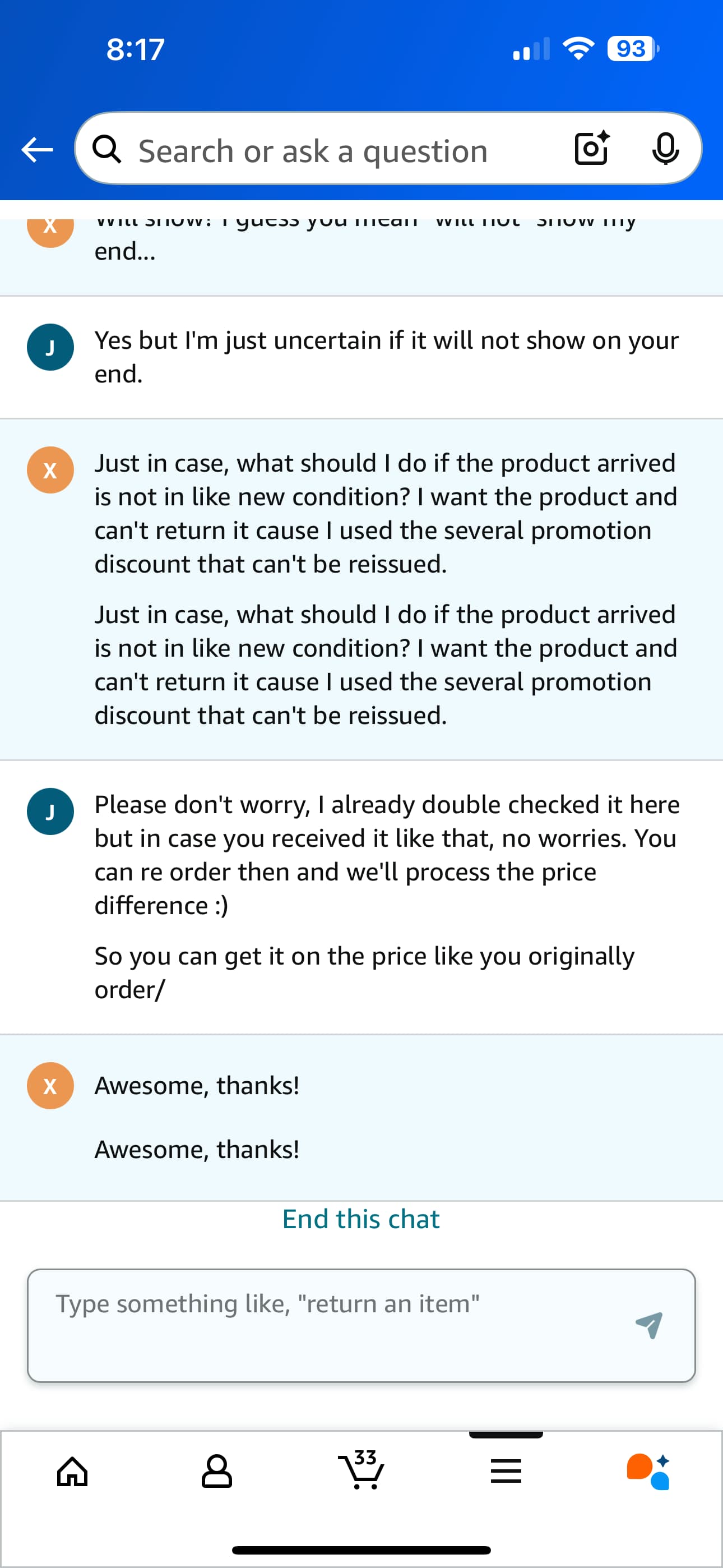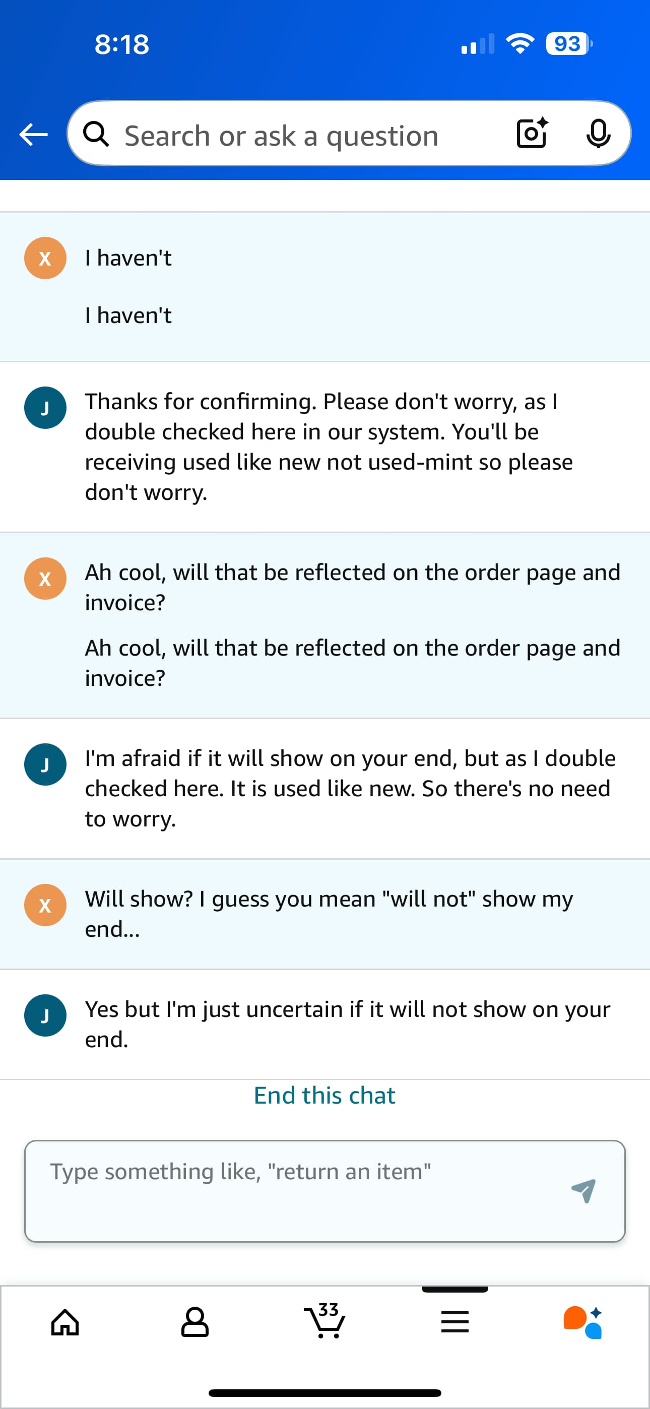 联系客服,第一级客服说看到确实是这个情况,和supervisor讨论后转到二级客服。二级客服说他那边数据库看到的是like new,会发like new,继续追问如果不是的解决方案,告知可以重新下单,让客服adjust price difference
