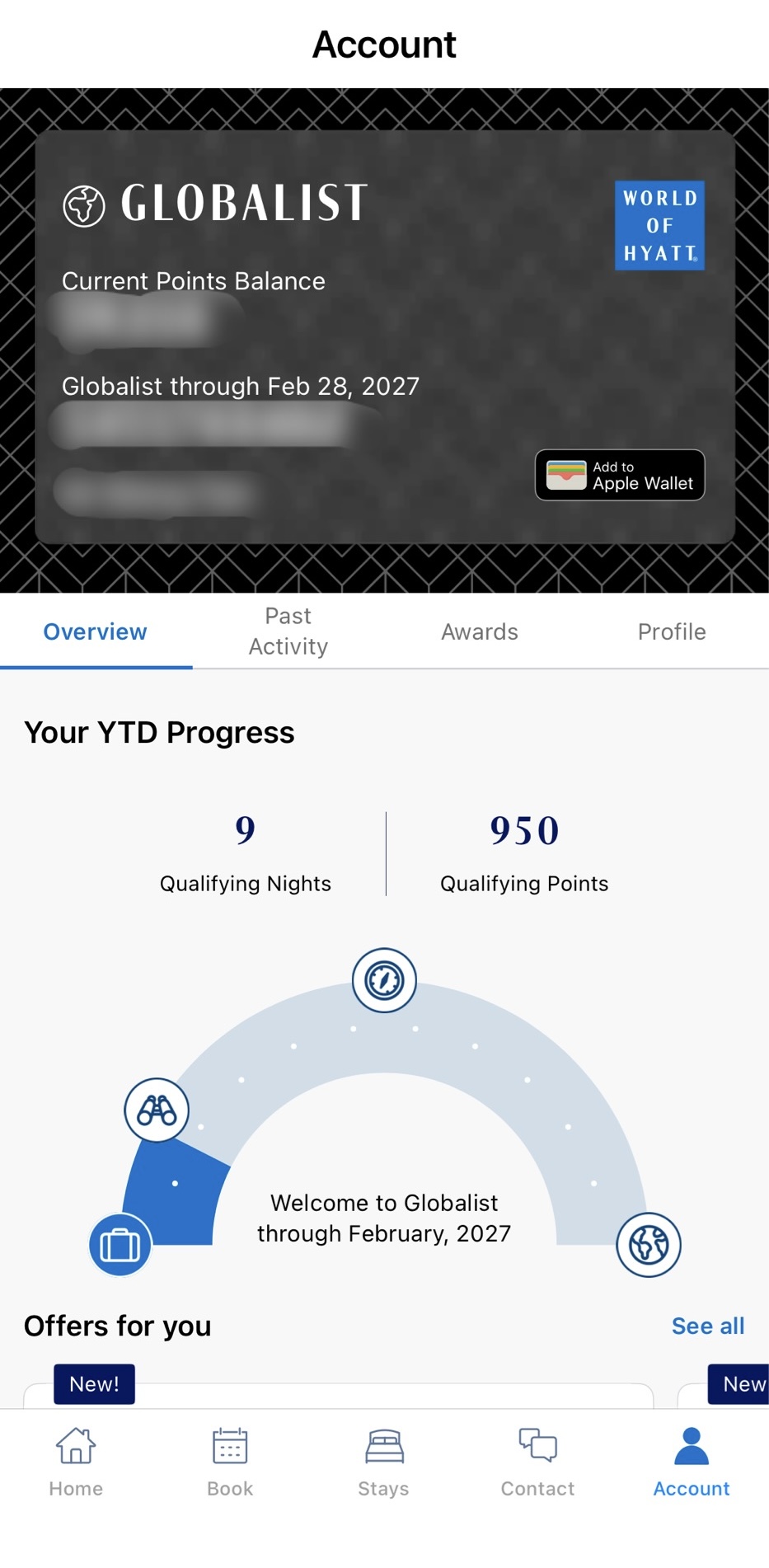 去App一查,确实已经显示Globalist身份,但我去年和今年都没刷够晚数,也没参加什么挑战活动,更没有Hyatt信用卡。