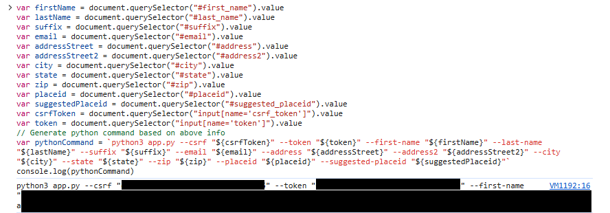 var pythonCommand = `python3 app.py --csrf "${csrfToken}" --token "${token}" --first-name "${firstName}" --last-name "${lastName}" --suffix "${suffix}" --email "${email}" --address "${addressStreet}" --address2 "${addressStreet2}" --city "${city}" --state "${state}" --zip "${zip}" --placeid "${placeid}" --suggested-placeid "${suggestedPlaceid}"`