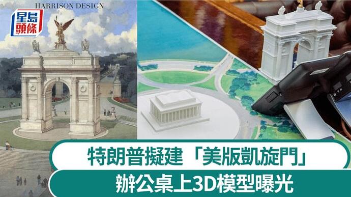 模型中,「美版凱旋門」位於阿靈頓公墓附近的中央環形交叉路口,跨越波多馬克河與林肯紀念堂相望,凱旋門頂部中間有由黃金打造的巨型翼天使,左右兩側各有1隻白鷹。事實上,特朗普9月中已透過社交媒體公布「美版凱旋門」的想像圖。
