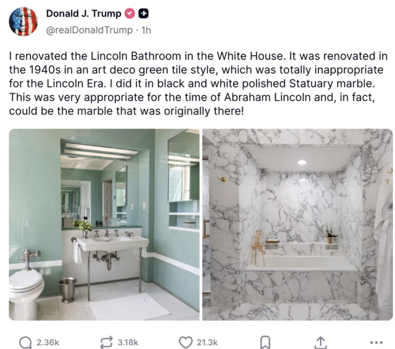 川普如今也加入了那些在白宫留下印记的总统之列。西奥多·罗斯福拆掉温室,建起了西翼;威廉·霍华德·塔夫脱在1909年修建了第一间椭圆形办公室;理查德·尼克松在1970年把白宫的游泳池改成了新闻发布厅;而现在的东翼,原本是在二战期间才建起来的,用来遮掩地下掩体。哈里·杜鲁门曾将白宫内部彻底翻新,并加上后来以他命名的阳台。那时也有不少纯粹主义者大加批评,但如今那阳台早已成了白宫标志之一。