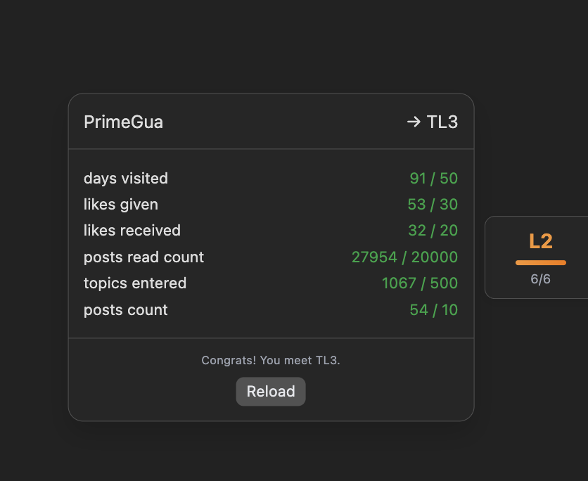 用ai魔改了 @uhhhh 的 魔改了个论坛脚本,能看 TL(TrustLevel) 升级进度 !!仅供参考 实际还有一些暗坑 详见描述!! 脚本,现在不需要装油猴,只需要建立浏览器书签把以下code加入地址栏然后点一下就可以看到论坛trust level升级状态了,祝大家早日白金
