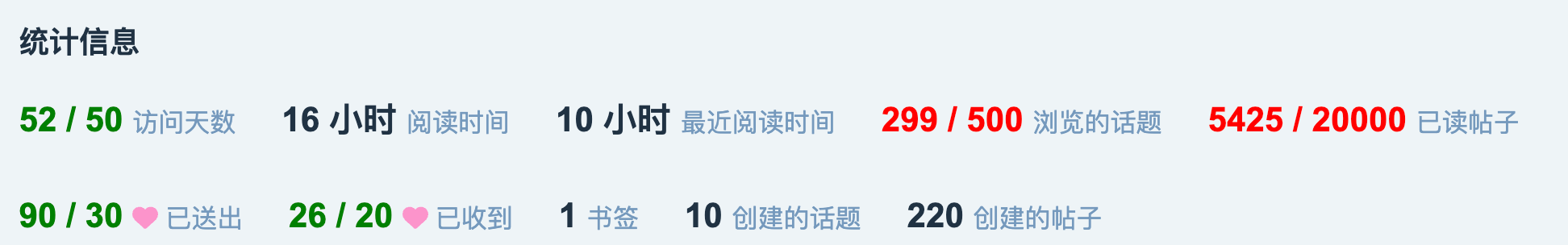 javascript:(() => {'use strict';function getApiBase(){const{origin,pathname}=location;const match=pathname.match(/^\/([^/]+)\/u\//);const baseDir=match?`/${match[1]}`:%27%27;return origin+baseDir;}const API_BASE=getApiBase();function getUsername(){const m=location.pathname.match(/\/u\/([^/?#]+)\//);return m?m[1]:null;}const TL_REQUIREMENTS={0:{topics_entered:5,posts_read_count:30,time_read:600},1:{days_visited:15,likes_given:1,likes_received:1,posts_count:3,topics_entered:20,posts_read_count:100,time_read:3600},2:{days_visited:50,posts_read_count:0,topics_entered:0,likes_given:30,likes_received:20,posts_count:10}};const TL3_MAINTAIN_IDX=2;const SELECTOR={days_visited:'li.stats-days-visited > div > span > span',likes_given:'li.stats-likes-given > a > div > span > span',likes_received:'li.stats-likes-received > div > span > span',posts_count:'li.stats-posts-count > a > div > span > span',topics_entered:'li.stats-topics-entered > div > span > span',posts_read_count:'li.stats-posts-read > div > span > span',time_read:'li.stats-time-read > div > span'};const fetchSiteStats=()=>fetch(%60${API_BASE}/about.json%60,{credentials:'same-origin'}).then(r=>r.ok?r.json():Promise.reject(r.status));const fetchUserDirStats=username=>fetch(%60${API_BASE}/directory_items?period=quarterly&order=days_visited%60,{credentials:'same-origin',headers:{'Accept':'application/json'}}).then(r=>r.ok?r.json():Promise.reject(r.status)).then(({directory_items})=>{const item=directory_items.find(i=>i.user?.username===username)||directory_items[0];if(!item)throw new Error('user not found');return{days_visited:item.days_visited,likes_given:item.likes_given,likes_received:item.likes_received,posts_count:item.post_count,topics_entered:item.topics_entered,posts_read_count:item.posts_read,time_read:null,trust_level:item.user?.trust_level??0};});const fetchUserSummary=username=>fetch(%60${API_BASE}/u/${username}/summary.json%60,{credentials:'same-origin',headers:{'Accept':'application/json'}}).then(r=>(r.ok?r.json():Promise.reject(r.status))).then(res=>({stats:res.user_summary,trust_level:res.users?.[0]?.trust_level??0}));function paintStats(trustLevel,stats){const target=TL_REQUIREMENTS[trustLevel]||TL_REQUIREMENTS[0];Object.keys(target).forEach(k=>{if(stats[k]==null)return;const el=document.querySelector(SELECTOR[k]);if(!el)return;el.textContent=k==='time_read'?%60${stats[k]} / ${target[k]} s%60:%60${stats[k]} / ${target[k]}%60;el.style.color=Number(stats[k])>=Number(target[k])?'green':'red';});}async function refresh(){const username=getUsername();if(!username)return;try{const[site,summaryObj,dir]=await Promise.all([fetchSiteStats(),fetchUserSummary(username),fetchUserDirStats(username)]);const stats={...summaryObj.stats};Object.entries(dir).forEach(([k,v])=>{if(v!=null&&k!=='trust_level')stats[k]=v;});const trustLevel=dir.trust_level??summaryObj.trust_level??0;const isMaintain=trustLevel>=3;const tierIndex=isMaintain?TL3_MAINTAIN_IDX:trustLevel;if(tierIndex===2){TL_REQUIREMENTS[2].posts_read_count=Math.min(Math.floor(site.about.stats.posts_30_days/4),20000);TL_REQUIREMENTS[2].topics_entered=Math.min(Math.floor(site.about.stats.topics_30_days/4),500);}paintStats(tierIndex,stats);}catch(e){console.error('[TL-Tracker] refresh error',e);}}refresh();})();