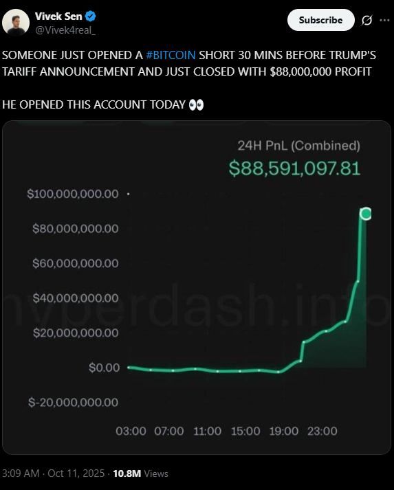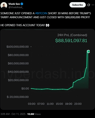 提前一天开户,大举卖空,特朗普宣布完100%关税的30分钟后平仓,获利1.9亿美元。