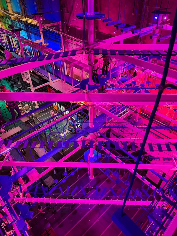 整套设备很新,在空中有两层,还有两条 decent-sized zipline 各绕场半周,可以从楼上滑到楼下。由于要控制场内人数,我们排了大约 45 分钟的队才入场,但上去以后人并不多,没有拥塞,而且可以想玩多久就玩多久。我们玩了一个小时,觉得还是很好玩的。