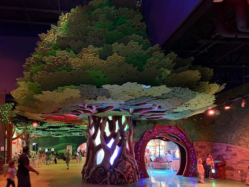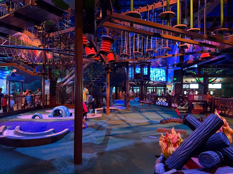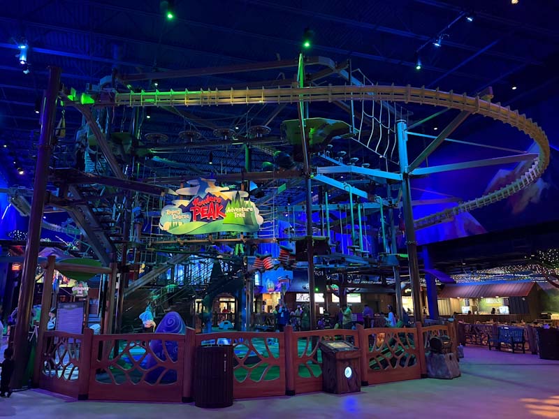 稍微有点新意的是 Dino Seas 展厅,需要单独购票,网上买 $12,现场买 $15……不过这里面既没有 dino 也没有 seas,而是有些互动游戏,有个不错的 playground,而且——居然也有一个 ropes course。这个 ropes course 和 Great Wolf Lodge 里的是同一家公司制作的,内容基本是一样的,但是规模要小得多,只有一层,zipline 也只有小得可怜的一个,还要自己用脚蹬或用手拉才能往前走。每人限时 16 分钟,但由于拥塞导致走不了几个 course 时间就到了,比较失望……我觉得如果打算去 Great Wolf Lodge 或者下文要讲的 It Adventure Ropes Course 的话,就没必要再玩这个了。