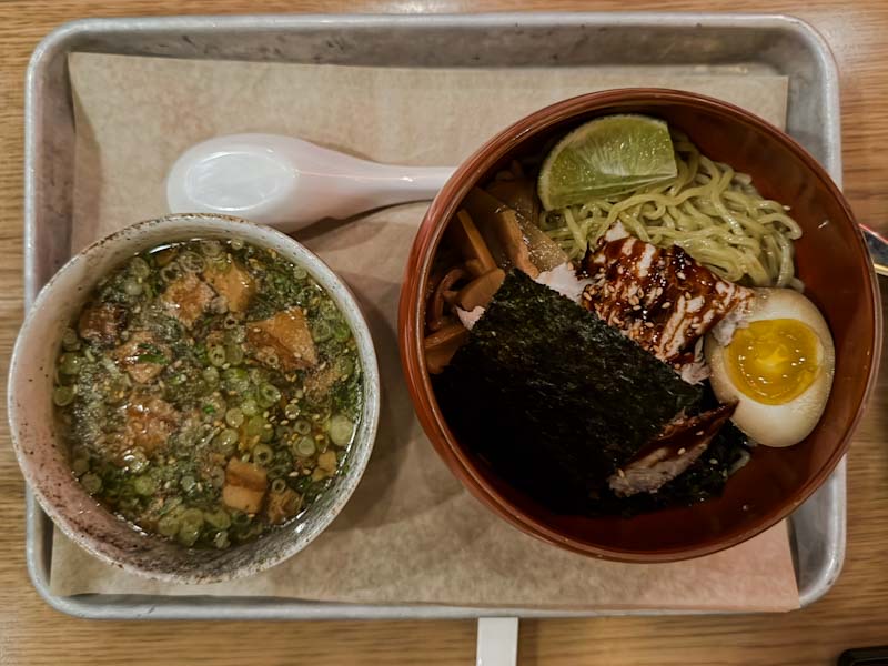 这家店的特色菜是烤鸭,但我和娃两个人怕吃不下就没点,只点了一碗拉面和一碗蘸面,都是 $18 但明显蘸面的货更多。叉烧肉上浇了很多酱,而且高菜味很浓,感觉有点神奇,但也不难吃 ![]()