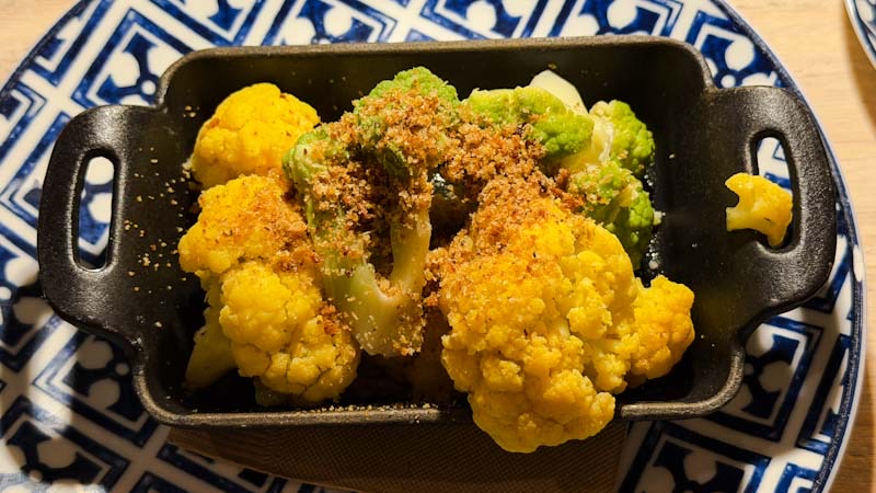 前菜点了 roasted tri-color cauliflower,$15,也是连铁锅一起端上来的,很好吃。不过我只看到了两种颜色的 ![]()